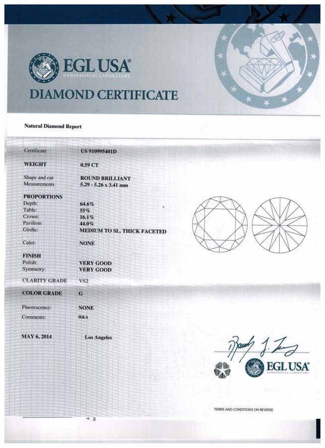 0.59 ct EGL Round Brilliant G, VS2, Solitaire Ring 18K Rose Gold RingSize US 6.5|**Certificate:910995401D|**Measurement:5.29-5.26x3.41mm|**Total Depth %:64.6|**Table %:55|**Girdle:Medium to SL. thick faceted |**Culet: None |**Polish:Very Good |**Symmetry:Very Good |**Flourescence:None