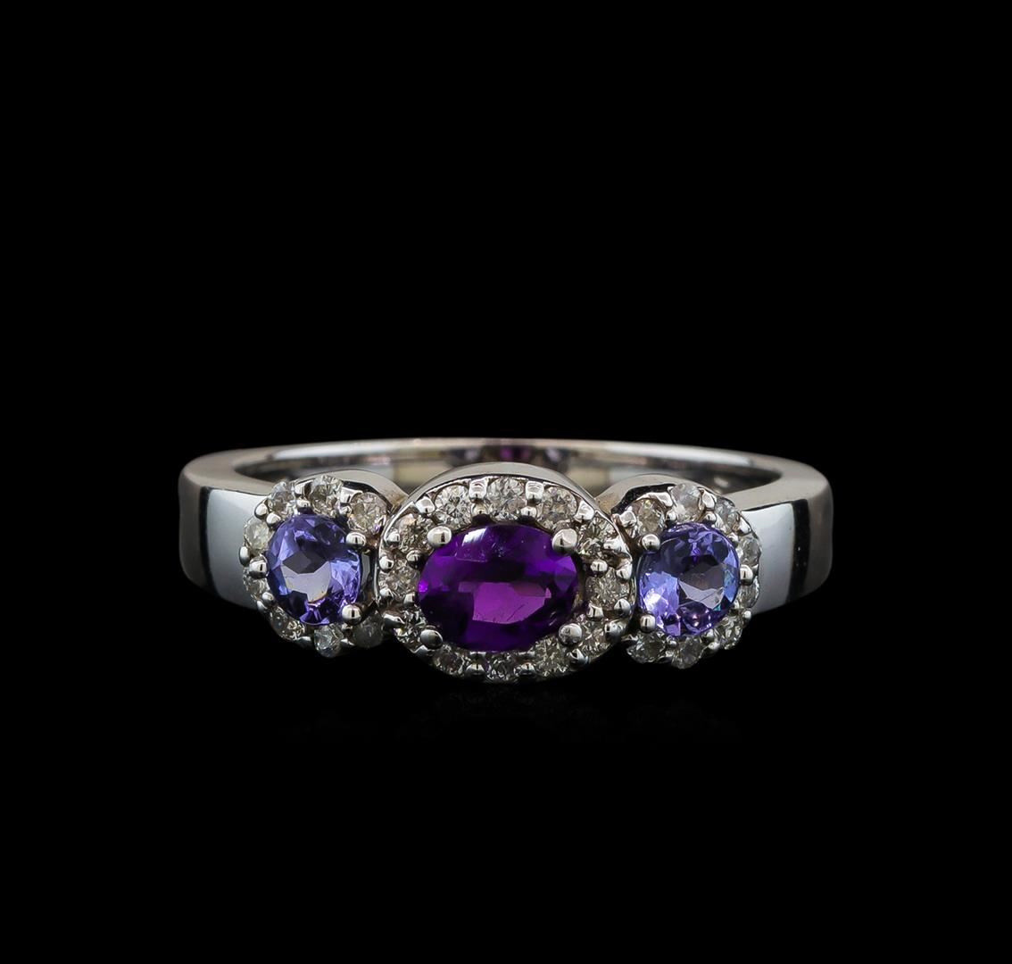 One ring featuring: 14KT white gold containing Amethyst and Tanzanite with a total weight of 0.59ct and diamonds with a total weight of 0.22ctw.