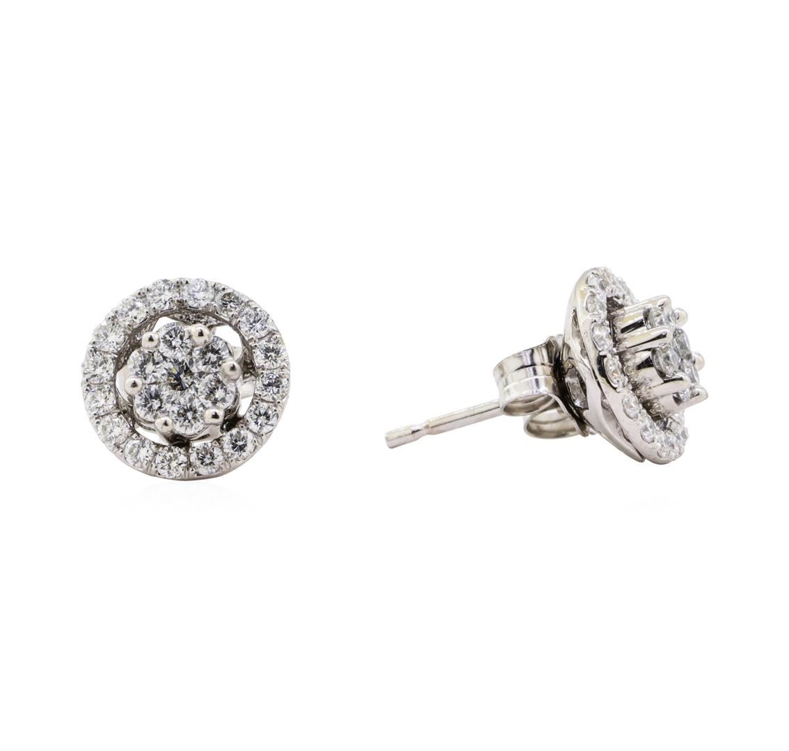 One pair electronically tested 14KT white gold lady's combination cast & assembled fashion stud earrings with earring jackets with medium friction backs with a bright polish finish. Identified with markings of '14K'. Condition is Good. Containing: Two prong set round brilliant cut diamonds, measuring 2.00 - 1.95 x 1.23mm (depth est.) approximate total weight of 2 Stones = 0.06ct. Graded in the setting. Color H - I Clarity SI-1 to SI-2 Cut Good Forty-Four prong set round brilliant cut diamonds, measuring 1.50 - 1.40 x 0.90mm (depth est.) approximate total weight of 44 Stones = 0.53ct. Graded in the setting. Color H - I Clarity SI-1 to SI-2 Cut Good. Total Weight of Diamonds 0.59ct.. Total Weight of Earrings With Earring Jackets 2.40gm GAS Appraised at $1985.00. GAS Appraised at $1,985.00.