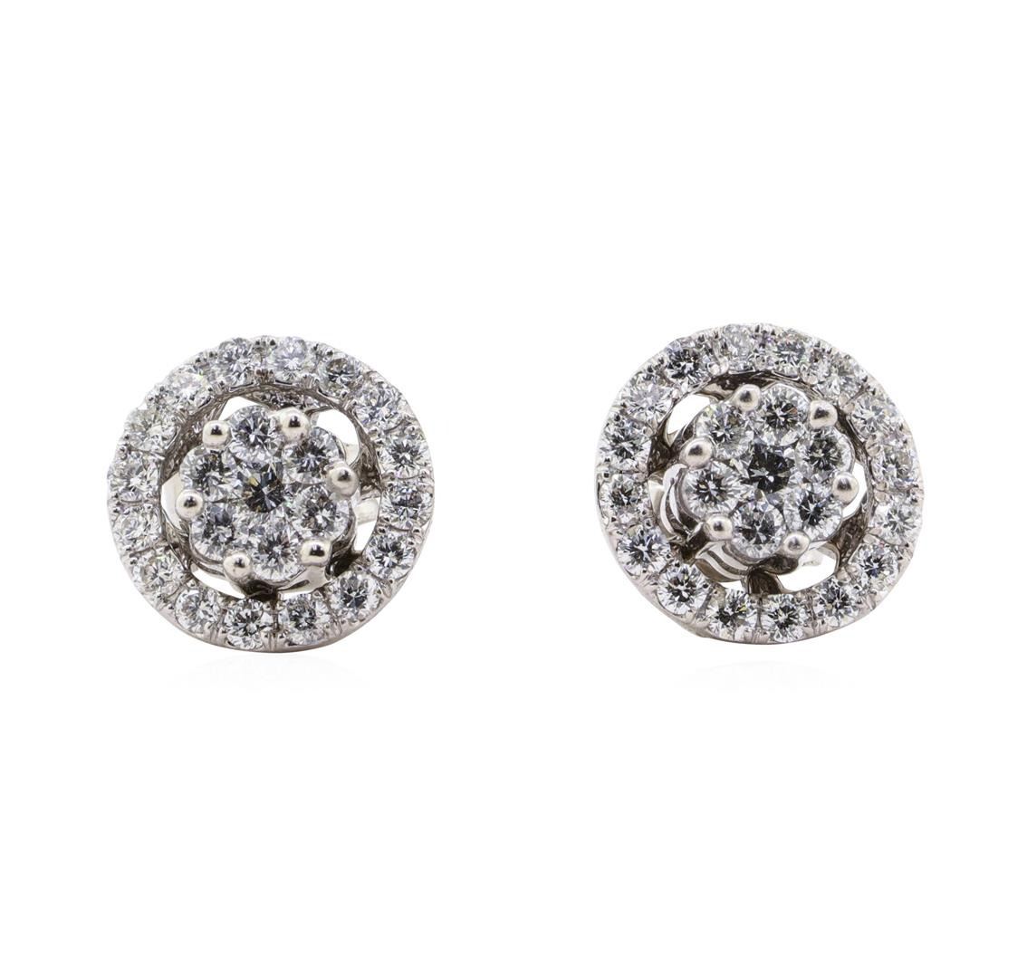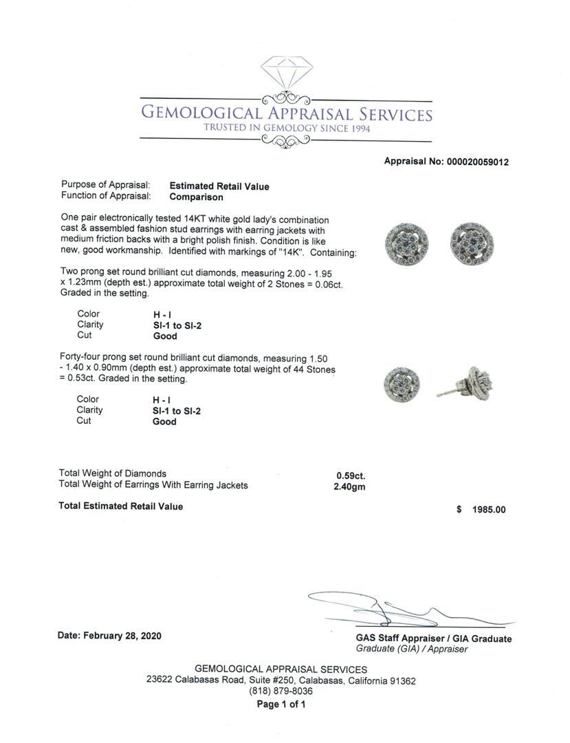 One pair electronically tested 14KT white gold lady's combination cast & assembled fashion stud earrings with earring jackets with medium friction backs with a bright polish finish. Identified with markings of '14K'. Condition is Good. Containing: Two prong set round brilliant cut diamonds, measuring 2.00 - 1.95 x 1.23mm (depth est.) approximate total weight of 2 Stones = 0.06ct. Graded in the setting. Color H - I Clarity SI-1 to SI-2 Cut Good Forty-Four prong set round brilliant cut diamonds, measuring 1.50 - 1.40 x 0.90mm (depth est.) approximate total weight of 44 Stones = 0.53ct. Graded in the setting. Color H - I Clarity SI-1 to SI-2 Cut Good. Total Weight of Diamonds 0.59ct.. Total Weight of Earrings With Earring Jackets 2.40gm GAS Appraised at $1985.00. GAS Appraised.