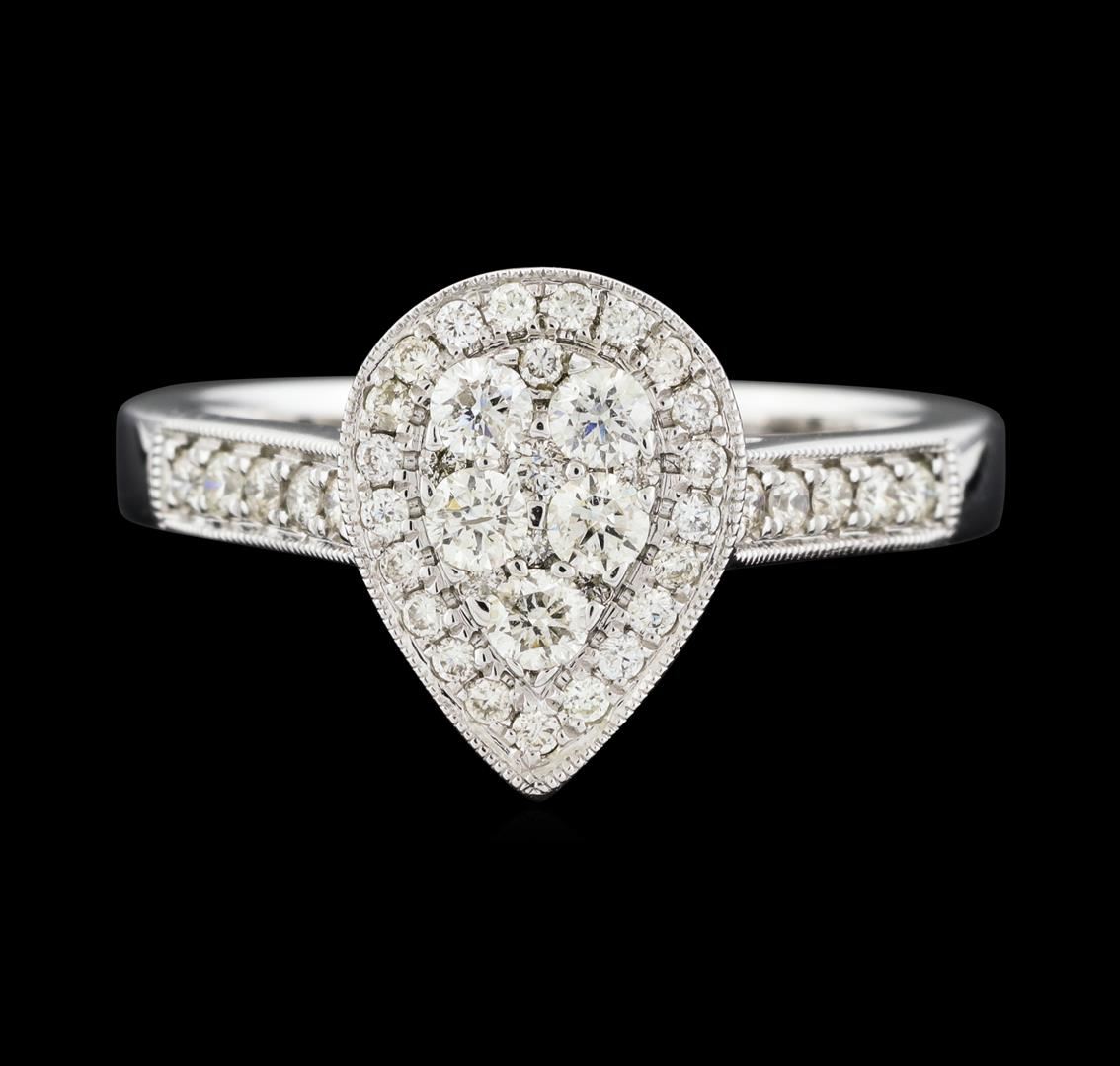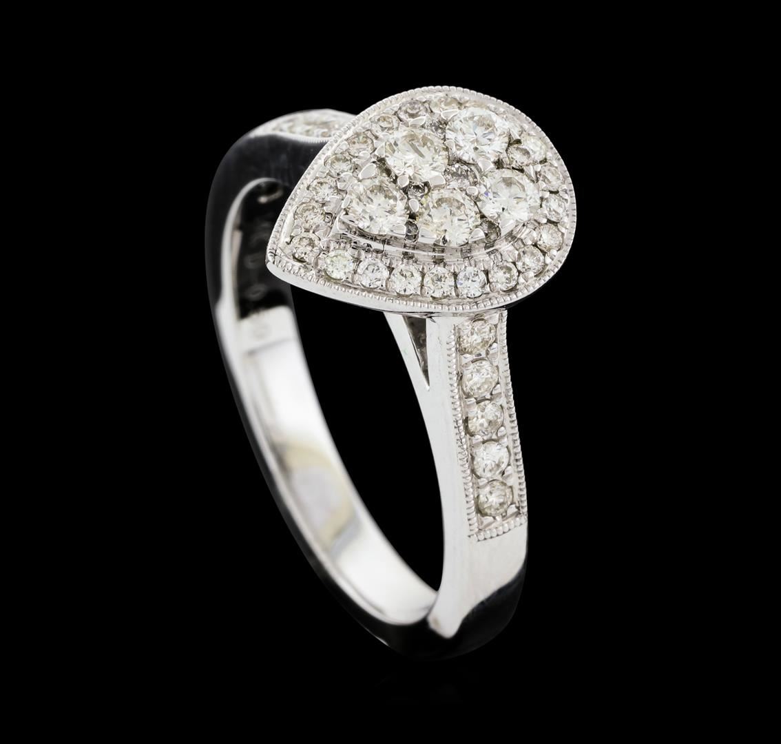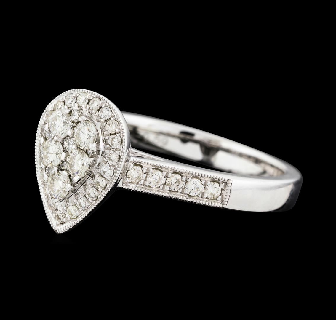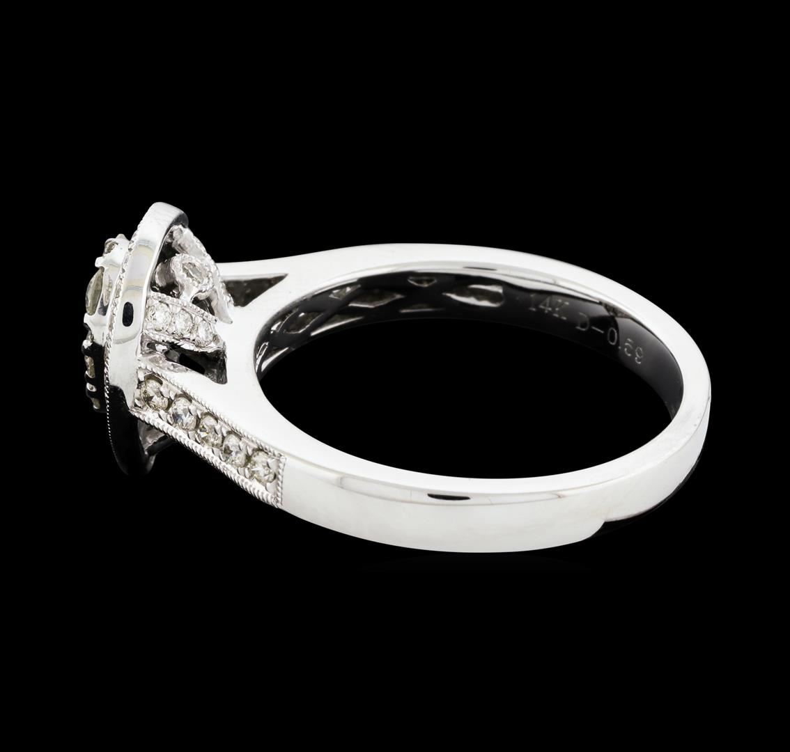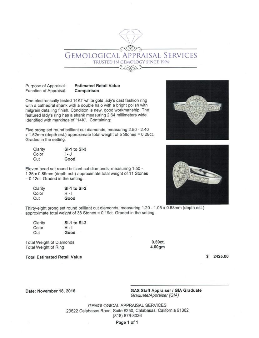 One electronically tested 14KT white gold lady's cast fashion ring with a cathedral shank with a double halo with a bright polish with milgrain detailing finish. The featured lady's ring has a shank measuring 2.64 millimeters wide. Identified with markings of '14K'. Condition is new, good workmanship. Containing: Five prong set round brilliant cut diamonds, measuring 2.50 - 2.40 x 1.52mm (depth est.) approximate total weight of 5 Stones = 0.28ct. Graded in the setting. Clarity SI-1 to SI-3. Color: I - J Cut Good Eleven bead set round brilliant cut diamonds, measuring 1.50 - 1.35 x 0.89mm (depth est.) approximate total weight of 11 Stones = 0.12ct. Graded in the setting. Clarity SI-1 to SI-2. Color: H - I Cut Good Thirty-Eight prong set round brilliant cut diamonds, measuring 1.20 - 1.05 x 0.68mm (depth est.) approximate total weight of 38 Stones = 0.19ct. Graded in the setting. Clarity SI-1 to SI-2. Color: H - I Cut Good. Total Weight of Diamonds 0.59ct.. Total Weight of Ring 4.60gm. GAS Appraised at $2,425.00.