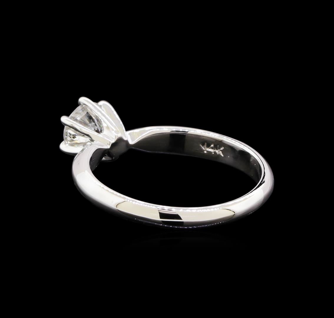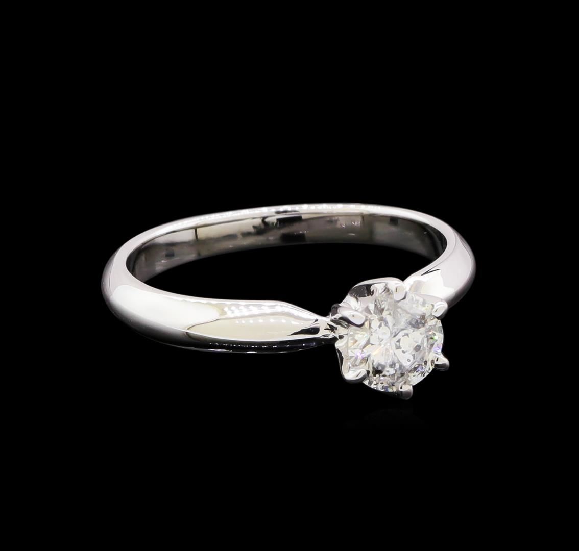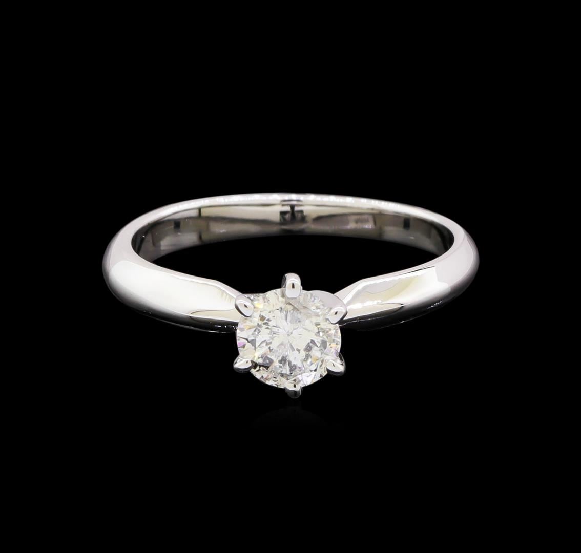 One electronically tested 14KT white gold ladies cast diamond solitaire ring with a bright polish finish. The featured diamond is completed by a two millimeter wide band. Identified with markings of "14K". Condition is new, good workmanship. Containing: One prong set round brilliant cut diamond, measuring 5.25 - 5.20 x 3.70mm (depth est.) approximate weight of 0.59ct with a medium blue fluorescence. Graded in the setting. Clarity: I-2. Color: F. Depth 70.8%. Table 68.8%. Total Weight of Diamonds 0.59ct. Total Weight of Ring 2.63gm. AIG Appraised at $2,875.00.