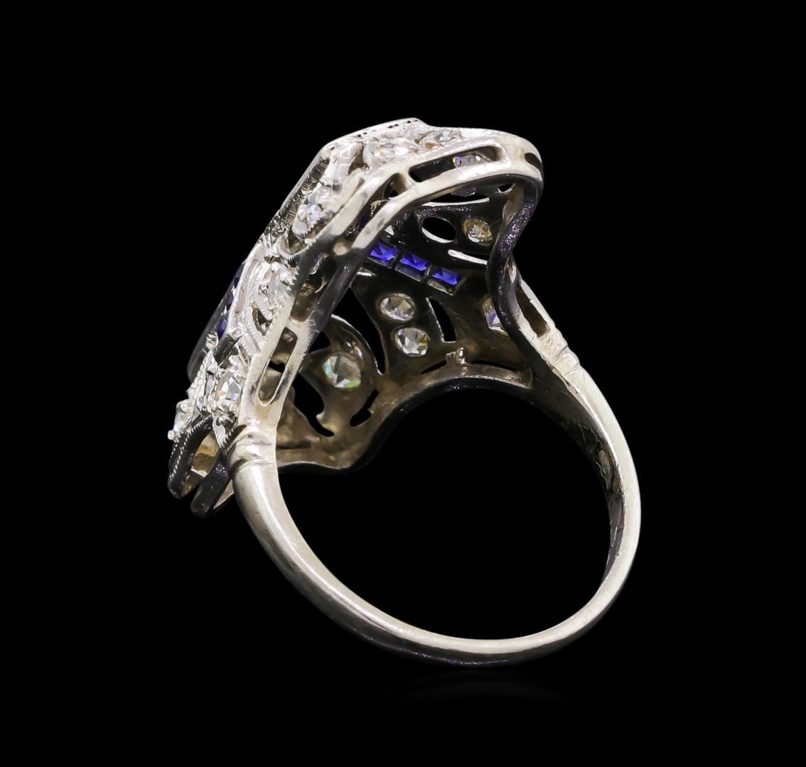One electronically tested platinum ladies cast diamond and sapphire ring. The ring features a vertical series of three diamonds set within a diamond set lattice curvature with sapphire ribbon accents, completed by a one millimeter wide band. Bright and patterned finish with milgrain detailing. Condition is good. Containing: One prong set transitional cut diamond, measuring 3.50 - 3.50 x 1.90mm (depth est.) approximate weight of 0.14ct. Graded in the setting. Clarity: I-1 . Color: G Two prong set transitional cut diamonds, measuring 3.00. - 2.80 x 1.80mm (depth est.) approximate total weight of 2 Stones = 0.19ct. Graded in the setting. Clarity: SI-1 . Color: G - H Ten prong set single cut diamonds, measuring 2.30 - 1.50 x 1.14mm (depth est.) approximate total weight of 10 Stones = 0.26ct. Graded in the setting. Clarity: SI-1 to I-1 . Color: G - I Six channel set square mixed cut blue sapphires, measuring 1.50 x 1.40 x 0.94mm, approximate total weight of 0.12ct., clarity is eye clean, type II, dark, moderately strong, blue color, (GIA B 7/4), cut is good. Transmitting light with no distortion, transparent. The group contains a mix of natural and laboratory created sapphires. Measurements & the color grade are an average for the group. raded in the setting. Total Weight of Colored Stones 0.12ct.. Total Weight of Diamonds 0.59ct.. Total Weight of Ring 4.63gm. AIG Appraised at $2,470.00.