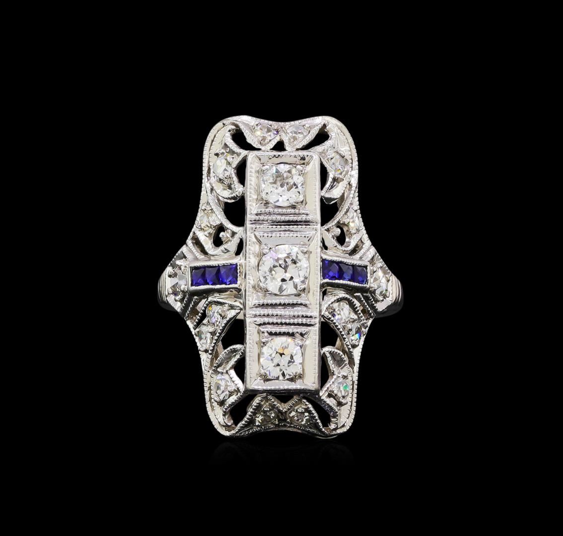 One electronically tested platinum ladies cast diamond and sapphire ring. The ring features a vertical series of three diamonds set within a diamond set lattice curvature with sapphire ribbon accents, completed by a one millimeter wide band. Bright and patterned finish with milgrain detailing. Condition is good. Containing: One prong set transitional cut diamond, measuring 3.50 - 3.50 x 1.90mm (depth est.) approximate weight of 0.14ct. Graded in the setting. Clarity: I-1 . Color: G Two prong set transitional cut diamonds, measuring 3.00. - 2.80 x 1.80mm (depth est.) approximate total weight of 2 Stones = 0.19ct. Graded in the setting. Clarity: SI-1 . Color: G - H Ten prong set single cut diamonds, measuring 2.30 - 1.50 x 1.14mm (depth est.) approximate total weight of 10 Stones = 0.26ct. Graded in the setting. Clarity: SI-1 to I-1 . Color: G - I Six channel set square mixed cut blue sapphires, measuring 1.50 x 1.40 x 0.94mm, approximate total weight of 0.12ct., clarity is eye clean, type II, dark, moderately strong, blue color, (GIA B 7/4), cut is good. Transmitting light with no distortion, transparent. The group contains a mix of natural and laboratory created sapphires. Measurements & the color grade are an average for the group. raded in the setting. Total Weight of Colored Stones 0.12ct.. Total Weight of Diamonds 0.59ct.. Total Weight of Ring 4.63gm. AIG Appraised at $2,470.00.