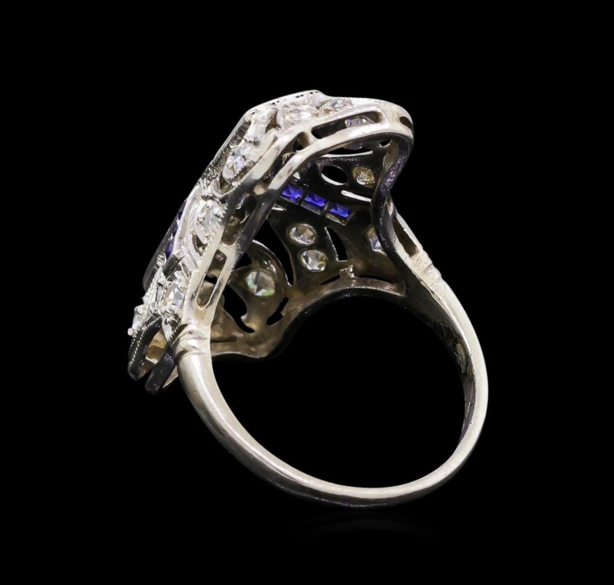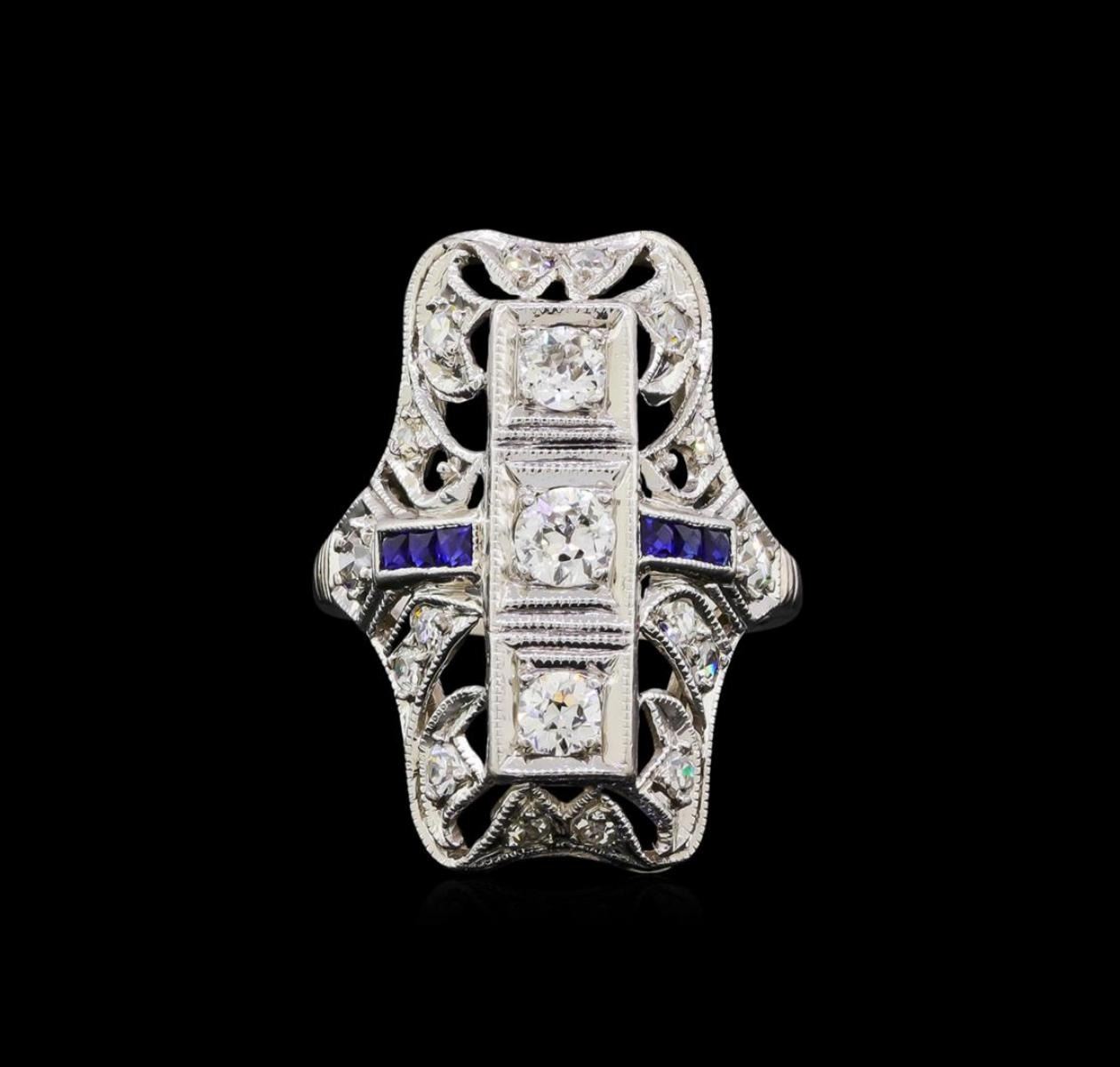 One electronically tested platinum ladies cast diamond and sapphire ring. The ring features a vertical series of three diamonds set within a diamond set lattice curvature with sapphire ribbon accents, completed by a one millimeter wide band. Bright and patterned finish with milgrain detailing. Condition is good. Containing: One prong set transitional cut diamond, measuring 3.50 - 3.50 x 1.90mm (depth est.) approximate weight of 0.14ct. Graded in the setting. Clarity: I-1 . Color: G Two prong set transitional cut diamonds, measuring 3.00. - 2.80 x 1.80mm (depth est.) approximate total weight of 2 Stones = 0.19ct. Graded in the setting. Clarity: SI-1 . Color: G - H Ten prong set single cut diamonds, measuring 2.30 - 1.50 x 1.14mm (depth est.) approximate total weight of 10 Stones = 0.26ct. Graded in the setting. Clarity: SI-1 to I-1 . Color: G - I Six channel set square mixed cut blue sapphires, measuring 1.50 x 1.40 x 0.94mm, approximate total weight of 0.12ct., clarity is eye clean, type II, dark, moderately strong, blue color, (GIA B 7/4), cut is good. Transmitting light with no distortion, transparent. The group contains a mix of natural and laboratory created sapphires. Measurements & the color grade are an average for the group. raded in the setting. Total Weight of Colored Stones 0.12ct.. Total Weight of Diamonds 0.59ct.. Total Weight of Ring 4.63gm. AIG Appraised.
