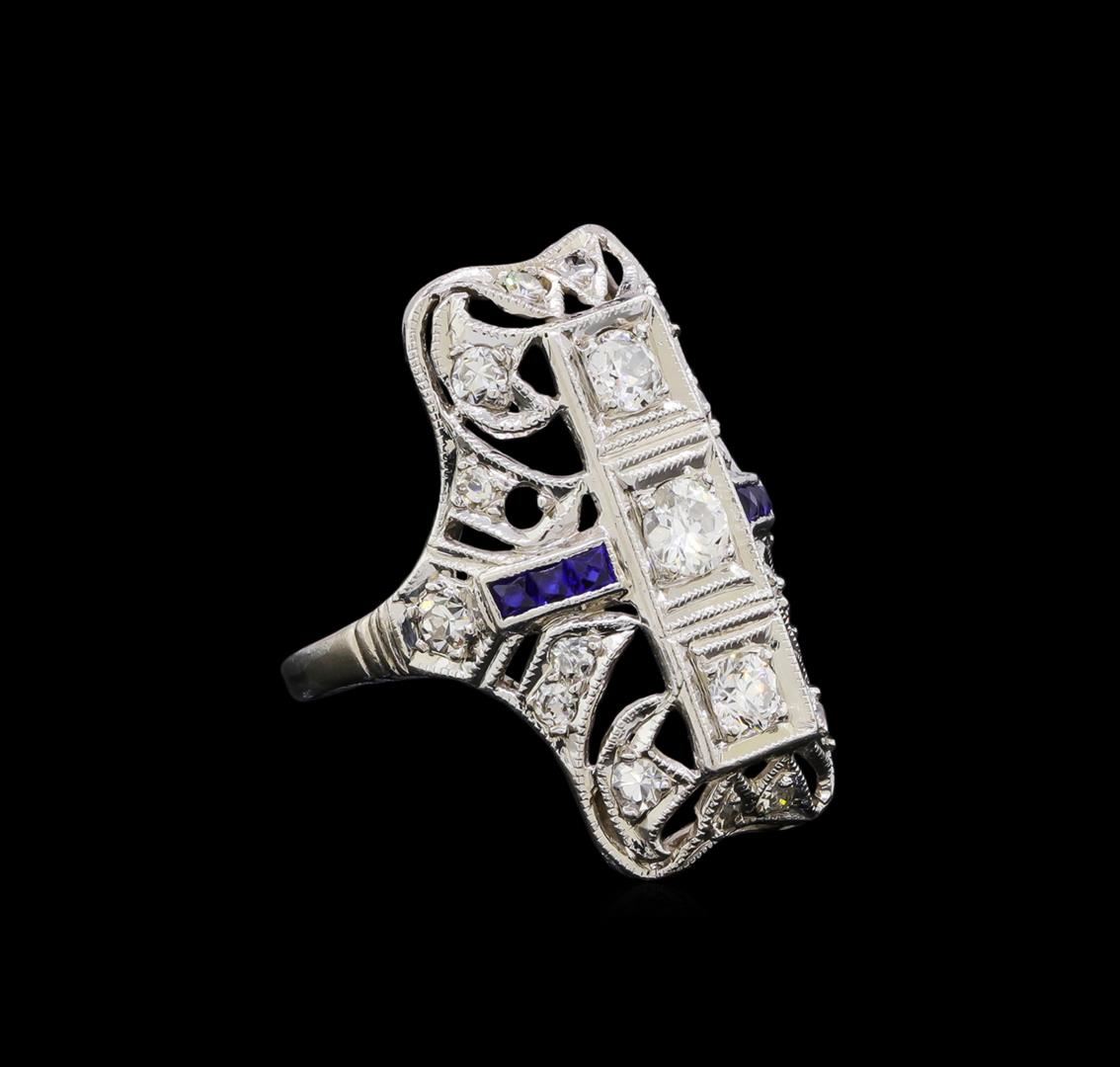One electronically tested platinum ladies cast diamond and sapphire ring. The ring features a vertical series of three diamonds set within a diamond set lattice curvature with sapphire ribbon accents, completed by a one millimeter wide band. Bright and patterned finish with milgrain detailing. Condition is good. Containing: One prong set transitional cut diamond, measuring 3.50 - 3.50 x 1.90mm (depth est.) approximate weight of 0.14ct. Graded in the setting. Clarity: I-1 . Color: G Two prong set transitional cut diamonds, measuring 3.00. - 2.80 x 1.80mm (depth est.) approximate total weight of 2 Stones = 0.19ct. Graded in the setting. Clarity: SI-1 . Color: G - H Ten prong set single cut diamonds, measuring 2.30 - 1.50 x 1.14mm (depth est.) approximate total weight of 10 Stones = 0.26ct. Graded in the setting. Clarity: SI-1 to I-1 . Color: G - I Six channel set square mixed cut blue sapphires, measuring 1.50 x 1.40 x 0.94mm, approximate total weight of 0.12ct., clarity is eye clean, type II, dark, moderately strong, blue color, (GIA B 7/4), cut is good. Transmitting light with no distortion, transparent. The group contains a mix of natural and laboratory created sapphires. Measurements & the color grade are an average for the group. raded in the setting. Total Weight of Colored Stones 0.12ct.. Total Weight of Diamonds 0.59ct.. Total Weight of Ring 4.63gm. AIG Appraised.