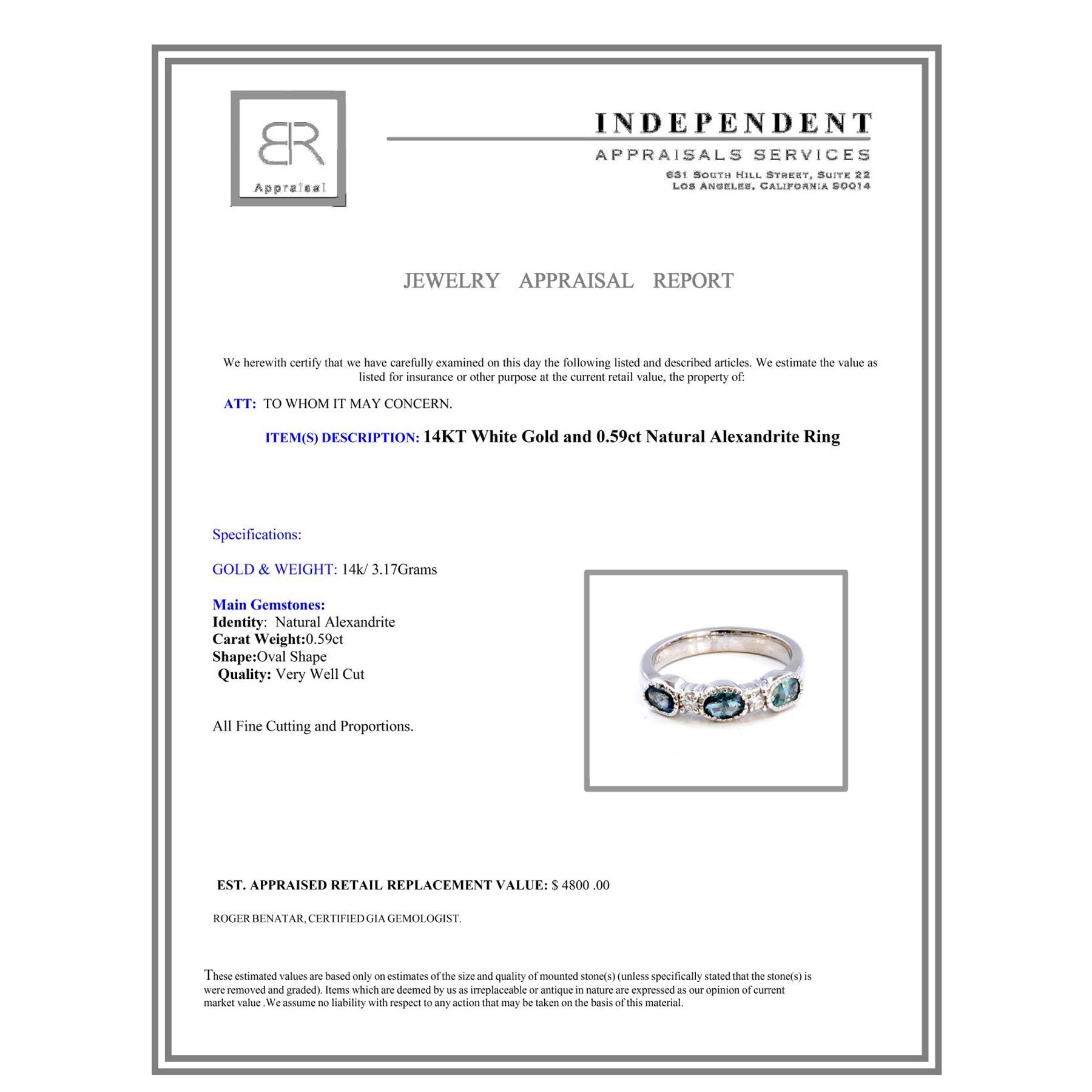 14K WHITE GOLD NATURAL ALEXANDRITE RING:3.17GRAM /ALEXANDRITE :0.59CT/#GVR1235 **A delightful trio of 0.59ct oval shape Natural Alexandrite is delicately crafted in 14K white gold. Alexandrite is believed to bring a joy that is related to the experience of revelation. This ring has a decidely classic and regal air; Its sleek detail draws the eye.**