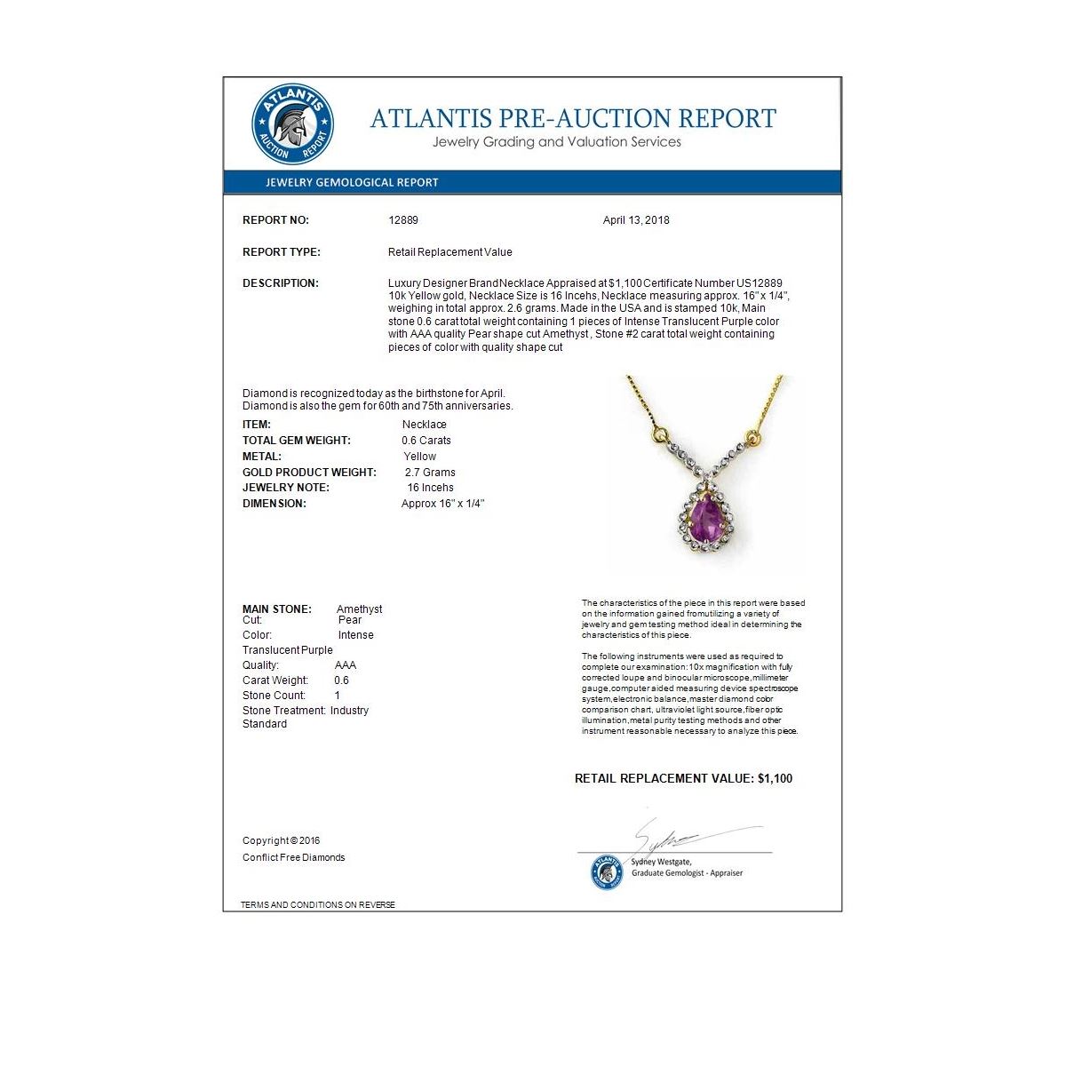 REF-16W8F -12889 ---- 0.60 CTW Amethyst Necklace 10K Yellow Gold ---- Luxury Designer Brand Necklace Appraised at $1,100 Certificate Number US12889  10k Yellow gold,  Necklace Size is 16 Incehs, Necklace measuring approx. 16" x  1/4", weighing in total approx. 2.6 grams. Made in the USA and is stamped 10k, Main stone 0.6 carat total weight containing 1 pieces of Intense Translucent Purple color with AAA quality Pear shape cut Amethyst , Stone #2  carat total weight containing  pieces of  color with quality  shape cut