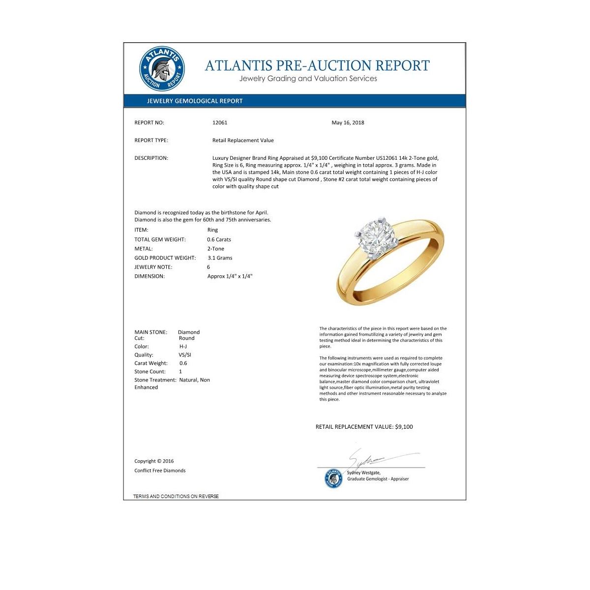 REF-184H2A -12061 ---- 0.60 CTW Certified VS/SI Diamond Solitaire Ring 14K 2-Tone Gold ---- Luxury Designer Brand Ring Appraised at $9,100 Certificate Number US12061 14k 2-Tone gold, Ring Size is 6, Ring measuring approx. 1/4" x 1/4" , weighing in total approx. 3 grams. Made in the USA and is stamped 14k, Main stone 0.6 carat total weight containing 1 pieces of H-J color with VS/SI quality Round shape cut Diamond , Stone #2 carat total weight containing pieces of color with quality shape cut