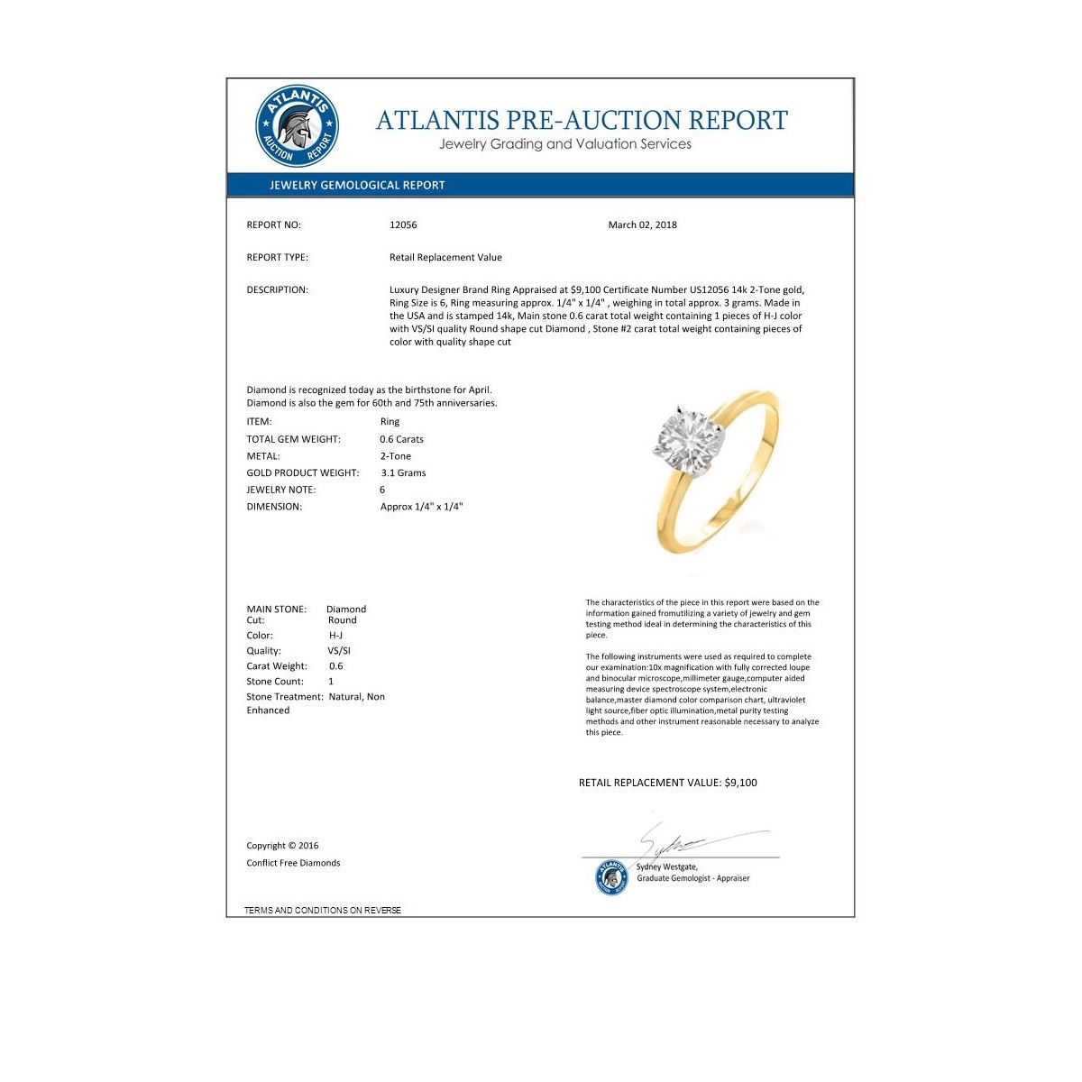 REF-184N2Y -12056 ---- 0.60 CTW Certified VS/SI Diamond Solitaire Ring 14K 2-Tone Gold ---- Luxury Designer Brand Ring Appraised at $9,100 Certificate Number US12056  14k 2-Tone gold,  Ring Size is 6, Ring measuring approx. 1/4" x  1/4" , weighing in total approx. 3 grams. Made in the USA and is stamped 14k, Main stone 0.6 carat total weight containing 1 pieces of H-J color with VS/SI quality Round shape cut Diamond , Stone #2  carat total weight containing  pieces of  color with quality  shape cut
