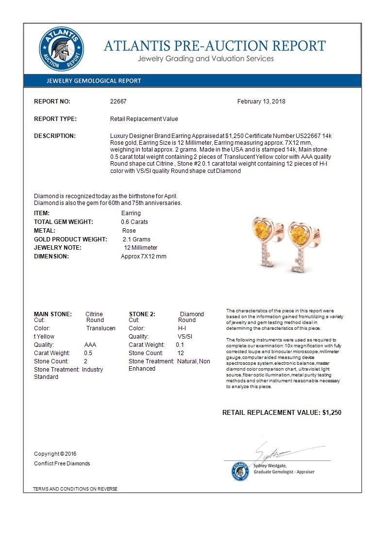 REF-20W8F -22667 ---- 0.60 CTW Citrine & VS/SI Diamond Micro Pave Key Of Heart Earrings 14K Rose Gold ---- Luxury Designer Brand Earring Appraised at $1,250 Certificate Number US22667 14k Rose gold, Earring Size is 12 Millimeter, Earring measuring approx. 7X12 mm, weighing in total approx. 2 grams. Made in the USA and is stamped 14k, Main stone 0.5 carat total weight containing 2 pieces of Translucent Yellow color with AAA quality Round shape cut Citrine , Stone #2 0.1 carat total weight containing 12 pieces of H-I color with VS/SI quality Round shape cut Diamond