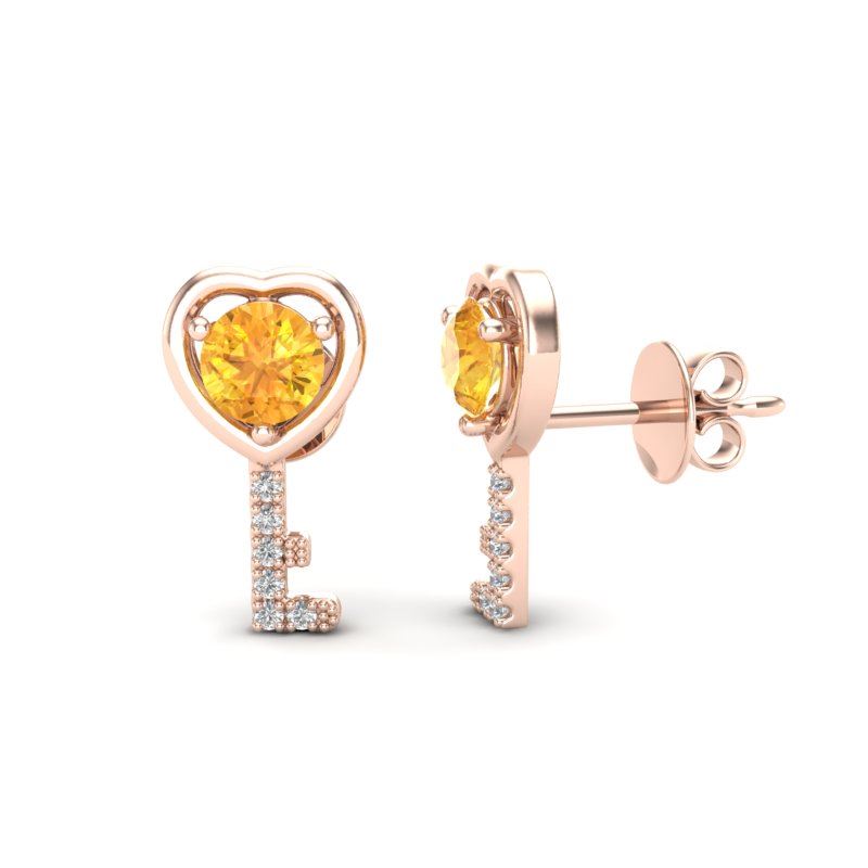 REF-20W8F -22667 ---- 0.60 CTW Citrine & VS/SI Diamond Micro Pave Key Of Heart Earrings 14K Rose Gold ---- Luxury Designer Brand Earring Appraised at $1,250 Certificate Number US22667 14k Rose gold, Earring Size is 12 Millimeter, Earring measuring approx. 7X12 mm, weighing in total approx. 2 grams. Made in the USA and is stamped 14k, Main stone 0.5 carat total weight containing 2 pieces of Translucent Yellow color with AAA quality Round shape cut Citrine , Stone #2 0.1 carat total weight containing 12 pieces of H-I color with VS/SI quality Round shape cut Diamond