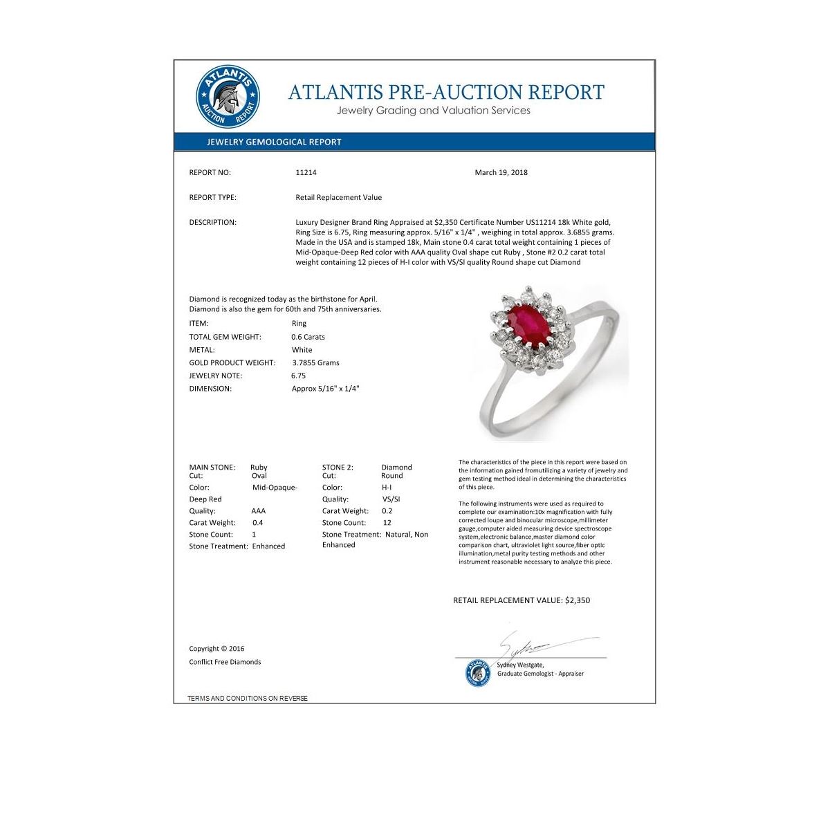 REF-35W6F -11214 ---- 0.60 CTW Ruby & Diamond Ring 18K White Gold ---- Luxury Designer Brand Ring Appraised at $2,350 Certificate Number US11214 18k White gold, Ring Size is 6.75, Ring measuring approx. 5/16" x 1/4" , weighing in total approx. 3.6855 grams. Made in the USA and is stamped 18k, Main stone 0.4 carat total weight containing 1 pieces of Mid-Opaque-Deep Red color with AAA quality Oval shape cut Ruby , Stone #2 0.2 carat total weight containing 12 pieces of H-I color with VS/SI quality Round shape cut Diamond