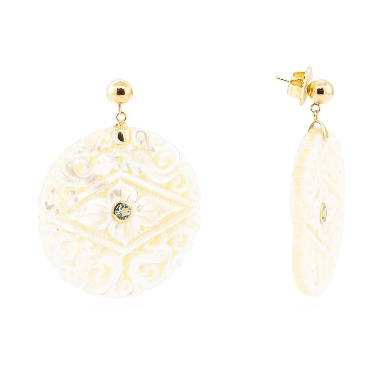 One pair of circle earrings with a total drop of 52 millimeters featuring: 14KT yellow gold weighing 22.1 grams containing two blue topazes weighing 0.60ctw and two circular, hand carved mother of pearl discs.