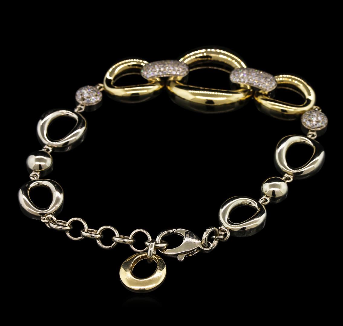 One electronically tested 14KT white and yellow gold lady's combination cast & assembled fashion bracelet with a lobster claw clasp with a bright polish finish. The featured lady's bracelet measures 8 inches in length with an adjustable option to 7 inches. Identified with markings of "14K". Condition is new, good workmanship. Containing: One Hundred Thirty-Six prong set round brilliant cut diamonds, measuring 1.10 - 1.00 x 0.68mm (depth est.) approximate total weight of 136 Stones = 0.60ct. Graded in the setting. Clarity: SI-2 to I-1. Color: I - Good. Total Weight of Diamonds 0.60ct. Total Weight of Bracelet 15.80gm. GAS Appraised at $4,765.00.