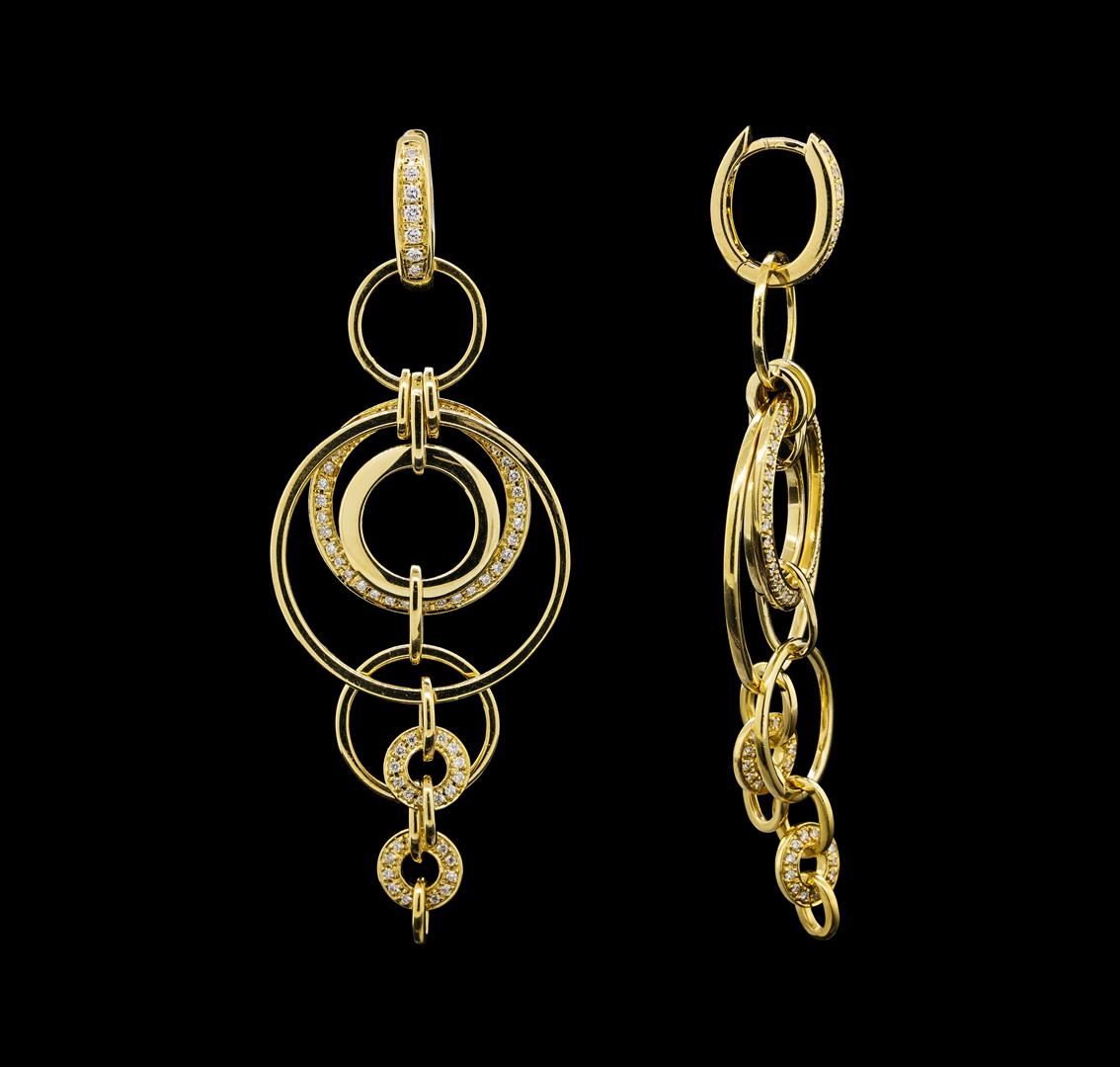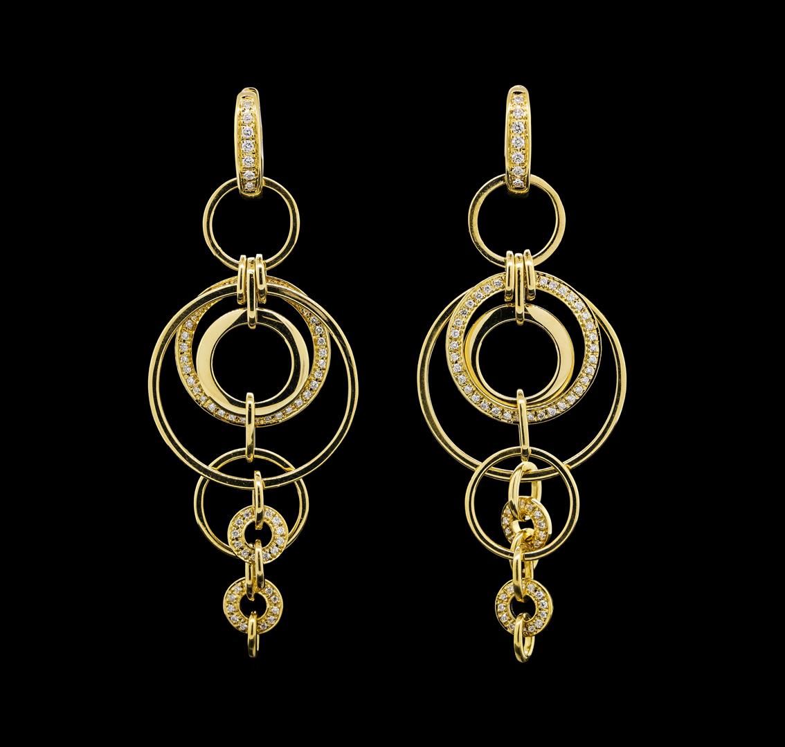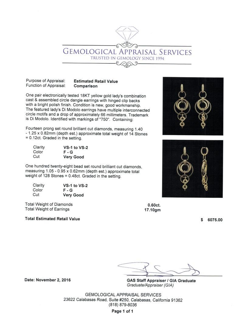 One pair electronically tested 18KT yellow gold lady's combination cast & assembled circle dangle earrings with hinged clip backs with a bright polish finish. The featured lady's Di Modolo earrings have multiple interconnected circle motifs and a drop of approximately 66 millimeters. Trademark is Di Modolo. Identified with markings of '750'. Condition is new, good workmanship. Containing: Fourteen prong set round brilliant cut diamonds, measuring 1.40 - 1.25 x 0.82mm (depth est.) approximate total weight of 14 Stones = 0.12ct. Graded in the setting. Clarity VS-1 to VS-2. Color: F - G Cut Very Good One Hundred Twenty-Eight bead set round brilliant cut diamonds, measuring 1.05 - 0.95 x 0.62mm (depth est.) approximate total weight of 128 Stones = 0.48ct. Graded in the setting. Clarity VS-1 to VS-2. Color: F - G Cut Very Good. Total Weight of Diamonds 0.60ct.. Total Weight of Earrings 17.10gm. GAS Appraised at $6,075.00.