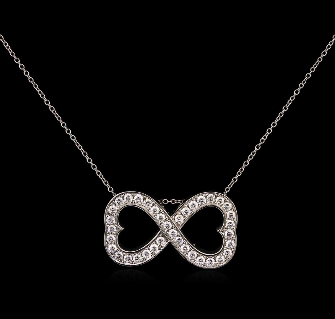 One infinity pendant with chain featuring: 14KT white gold weighing 6.16 grams containing diamonds with a total weight of 0.60ct.