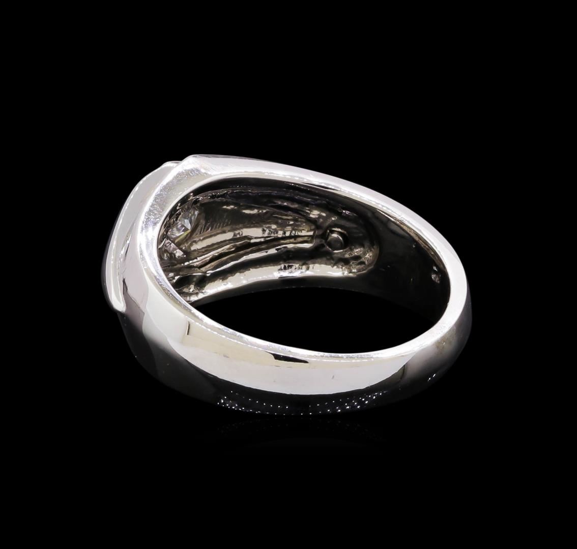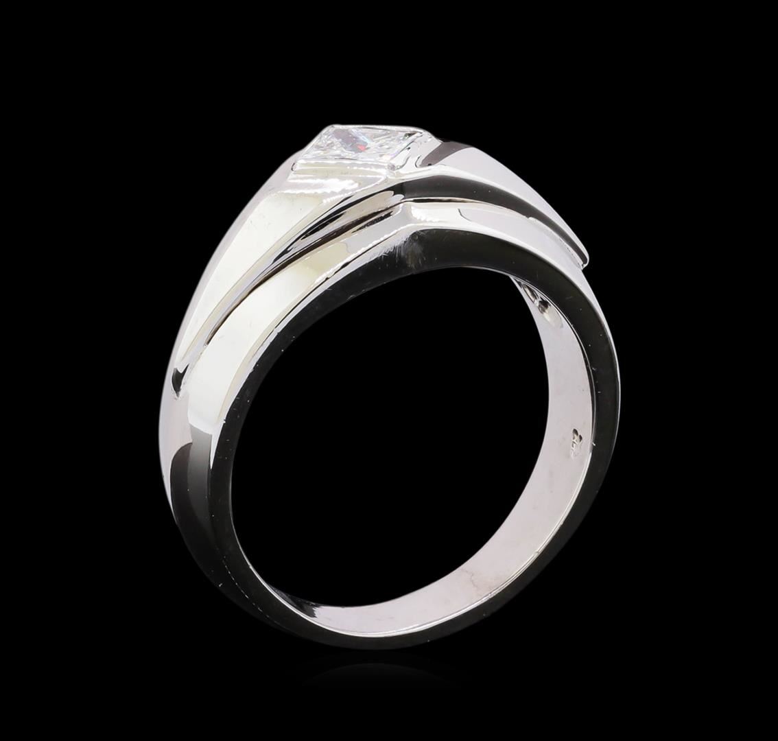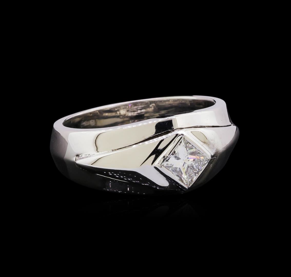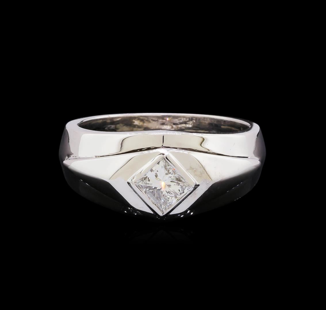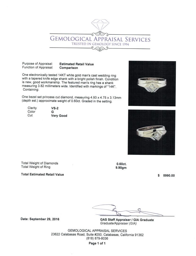 One electronically tested 14KT white gold man's cast wedding ring with a tapered knife edge shank with a bright polish finish. The featured man's ring has a shank measuring 3.82 millimeters wide. Identified with markings of '14K'. Condition is new, good workmanship. Containing: One bezel set princess cut diamond, measuring 4.93 x 4.75 x 3.13mm (depth est.) approximate weight of 0.60ct. Graded in the setting. Clarity VS-2. Color: G Cut Very Good. Total Weight of Diamonds 0.60ct.. Total Weight of Ring 9.90gm. GAS Appraised at $5,990.00.