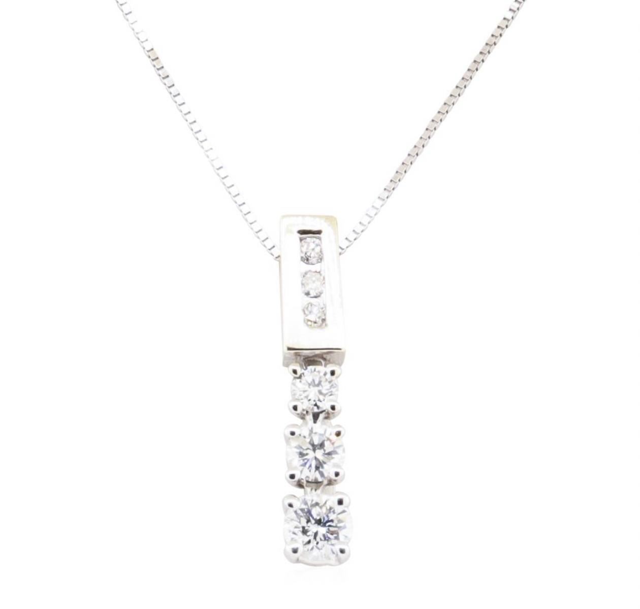 One straight line diamond Past, Present, Future three stone pendant with an attached eighteen inch box link chain featuring: 14KT white gold weighing 2.6 grams containing diamonds weighing 0.60 ctw.