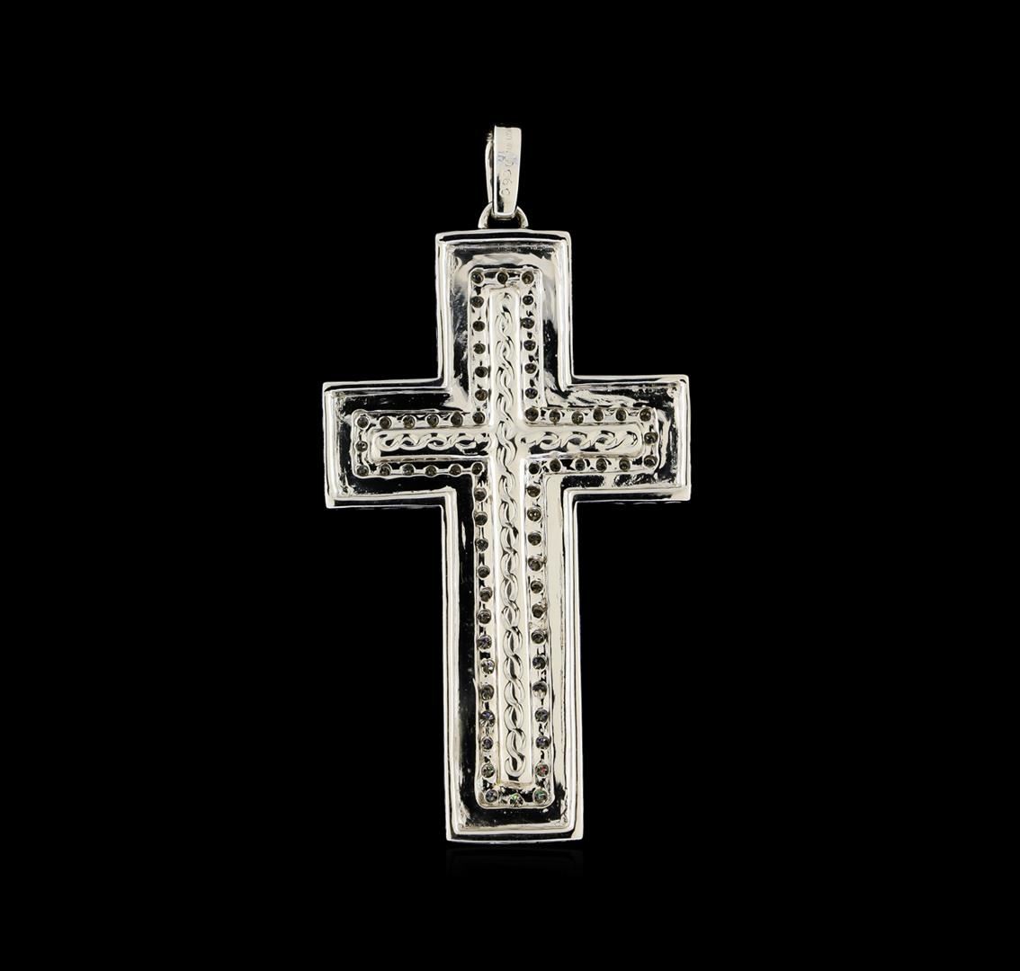 One electronically tested 18KT white gold cast & assembled onyx and diamond "cross" pendant. The pendant features a 36.0 x 18.0mm onyx cross set within an inner diamond bezel and an outer white gold patterned bezel, completed by a white gold bail. Bright polish finish. Area measurements 2.00 x 1.00 inch. Identified with markings of "K18". Condition is good. Containing: Sixty-Six prong set round brilliant cut diamonds, measuring 1.30 - 1.20 x 0.75mm (depth est.) approximate total weight of 66 Stones = 0.60ct. Graded in the setting. Clarity: SI-1 to SI-2. Color: G - I. Total Weight of Diamonds 0.60ct. Total Weight of Pendant 9.68gm. AIG Appraised at $4,305.00.