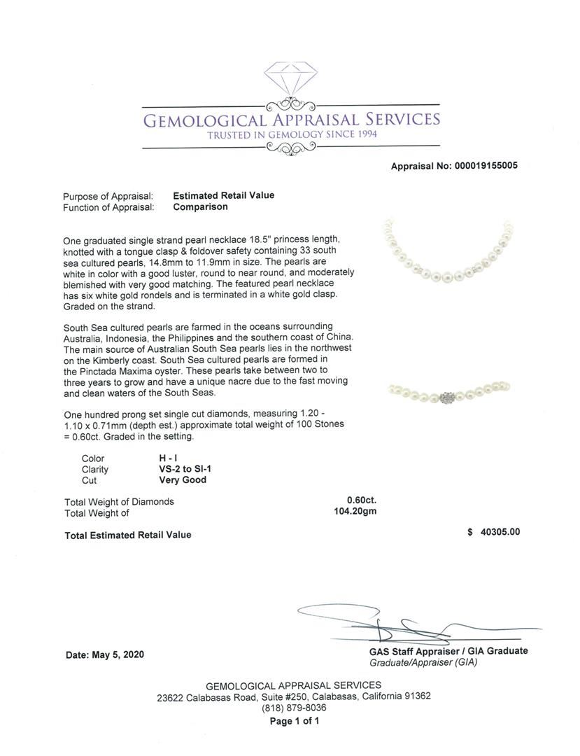One graduated single strand pearl necklace 18.5' princess length, knotted with a tongue clasp & foldover safety containing 33 south sea cultured pearls, 14.8mm to 11.9mm in size. The pearls are white in color with a good luster, round to near round, and m GAS Appraised.