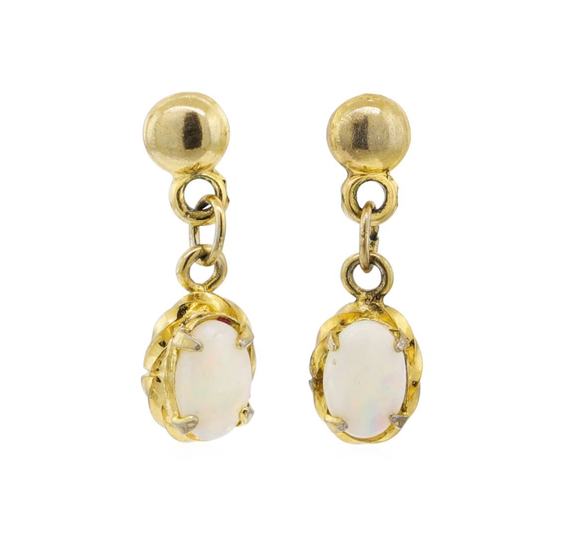 One pair of dangle earrings with friction posts featuring: 14KT yellow gold weighing 1.0 grams containing two oval cabochon opals weighing 0.60ctw.