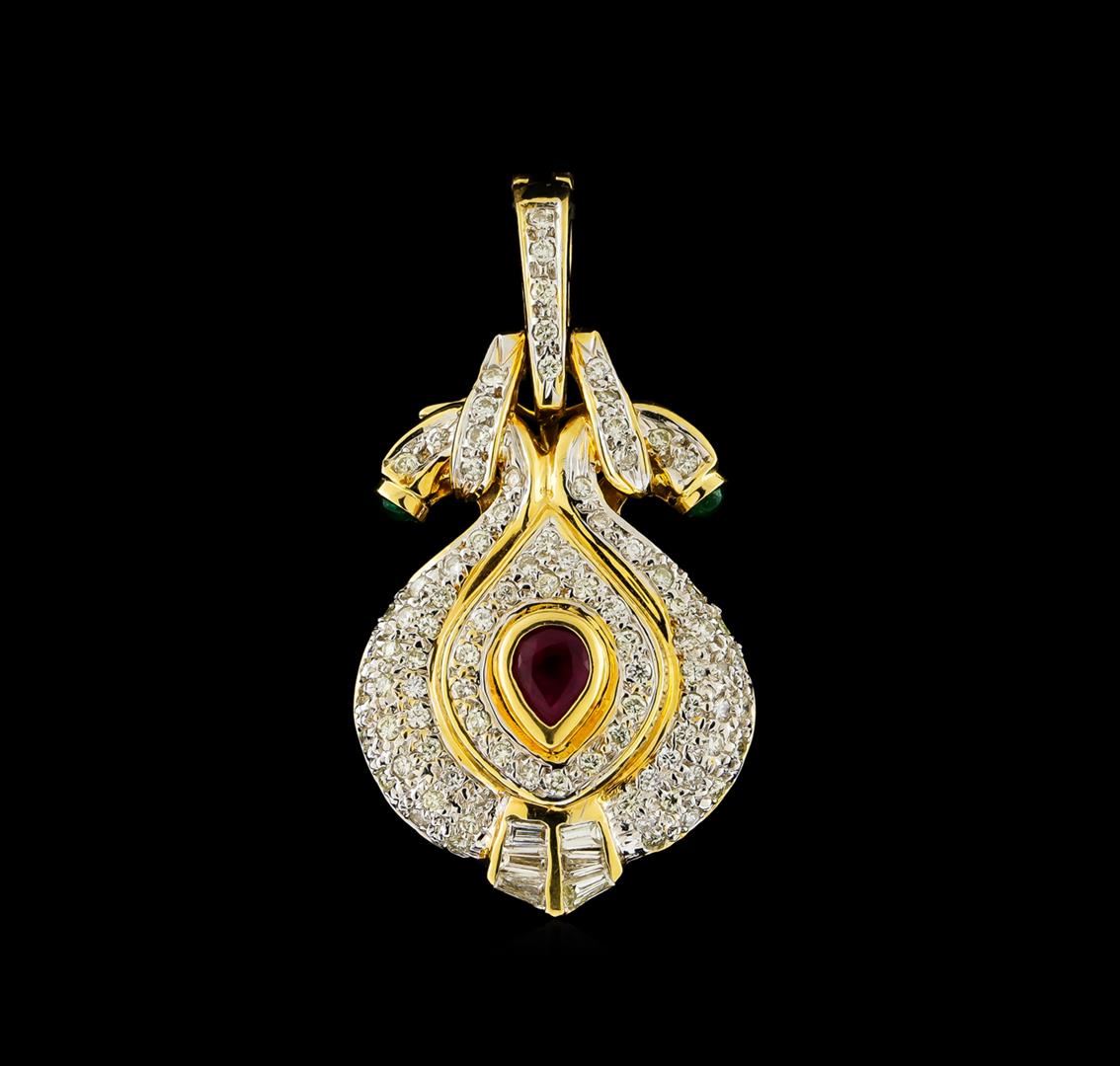 One electronically tested 18KT yellow gold ladies cast & assembled lab created ruby, emerald & diamond pendant/enhancer. The pendant/enhancer features a laboratory created ruby set within stylized tiered diamond bezels supported by interlocking diamond ribbons with two emerald cabochon end caps. completed by a hinged snap-locking diamond set bail with safety. Bright polish finish with rhodium accents. Identified with markings of "18K 750". Condition is good. Containing: One bezel set pear mixed cut laboratory created ruby, measuring 5.30 x 4.25 x 3.15mm, approximate weight of 0.60ct., clarity is heavily included, type II, medium dark, moderately strong, red color, (GIA R 6/4), cut is good. Transmitting light with a minimum of distortion, transparent. Laboratory created internal & external characteristics are present. Graded in the setting. Two bezel set round cabochon cut natural emeralds, measuring 2.40 x 2.30 x 1.20mm, approximate total weight of 0.12ct., clarity is moderately included, type III, medium dark, very slightly grayish, very slightly bluish green color, (GIA vslbG 6/3), cut is good. Transmitting light with a minimum of distortion, transparent. Naturally occurring internal & external characteristics are present. Color grade is an average for the group. Graded in the setting. Six channel set baguette cut (tapered) diamonds, measuring from 2.50 x 1.20 x 0.84mm (depth est.) to 2.90 x 1.30 x 0.91mm (depth est.) approximate total weight of 6 Stones = 0.16ct. Graded in the setting. Clarity: SI-1 to SI-2. Color: H - I Ninety bead set round brilliant cut diamonds, measuring 1.40 - 1.30 x 0.81mm (depth est.) approximate total weight of 90 Stones = 0.91ct. Graded in the setting. Clarity: I-1 to I-2. Color: H - J. Total Weight of Colored Stones 0.72ct. Total Weight of Diamonds 1.07ct. Total Weight of Pendant/Enhancer 13.43gm. AIG Appraised at $5,810.00.