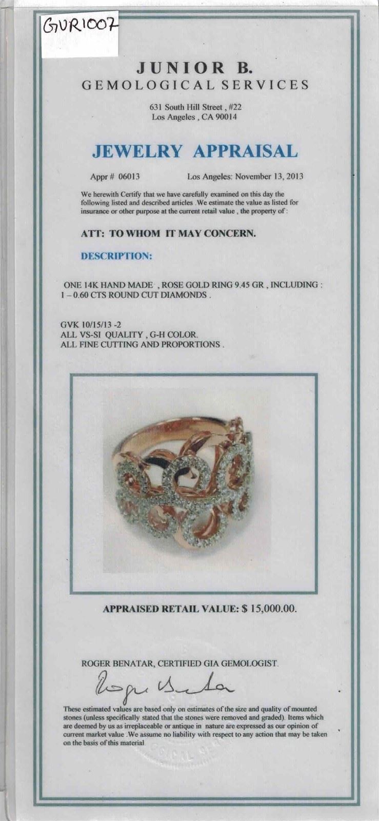 14K ROSE GOLD NATURAL DIAMOND RING:9.45GRAMS/DIAMOND:0.60CT/#GVR1007 **Delicately mounted in 14k rose gold, this hand made ring boasts twinkling scrolls of 0.60ct round cut diamonds, set in a motif of curling waves, adding to this piece a unique embrace of divinity. This ring is sure to sweep imaginations.**
