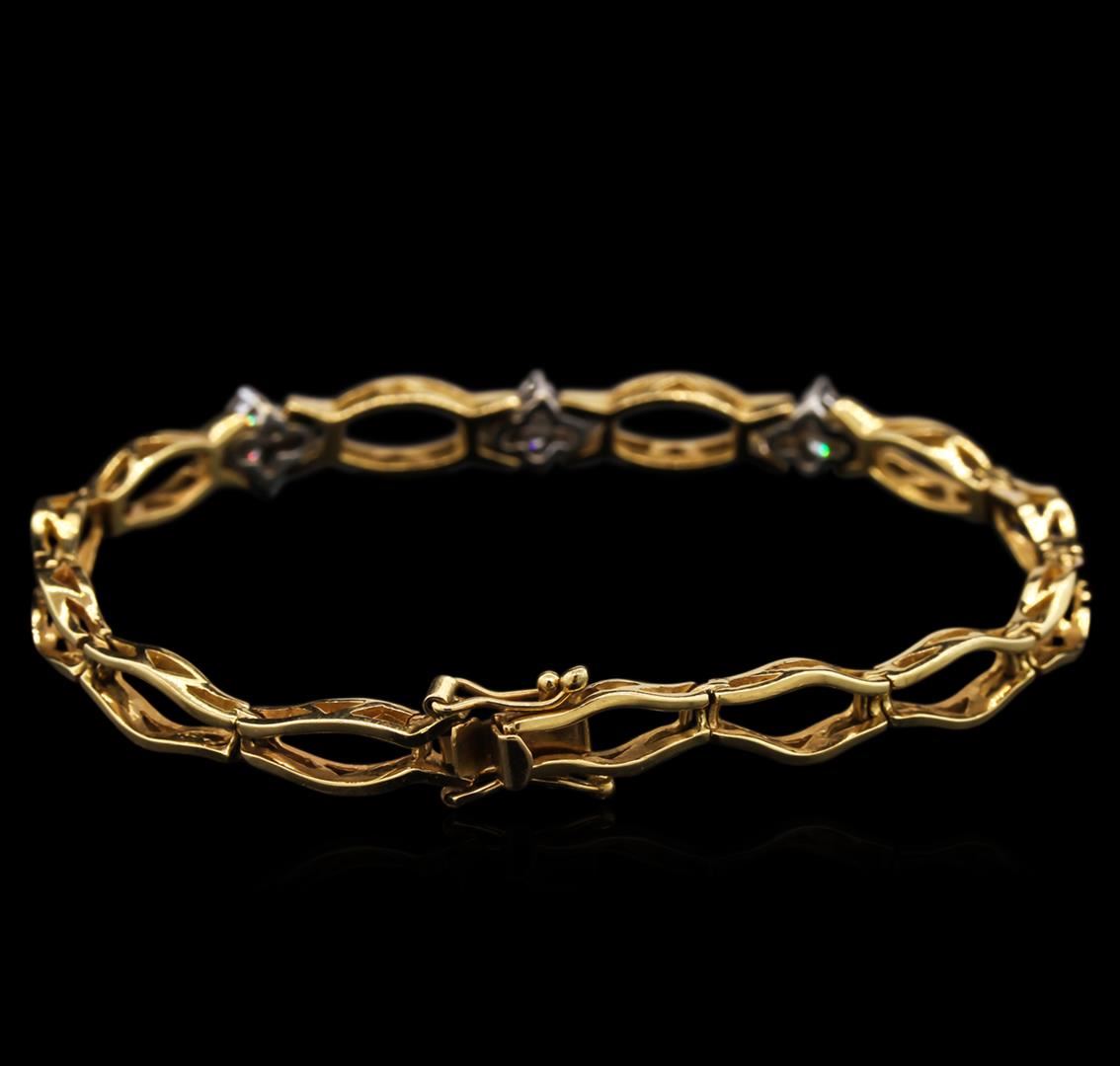 One electronically tested 14KT yellow and white gold lady's combination cast & assembled fashion bracelet with a tongue clasp with foldover safety with a bright polish finish. The featured lady's bracelet measures 7" long. Condition is used, good workmanship. Containing: Twelve prong set round brilliant cut diamonds, measuring 2.40 - 2.30 x 1.48mm (depth est.) approximate. Total Weight of 12 Stones = 0.60ct. Graded in the setting. Clarity: VS-2 to SI-1. Color: H - I. Cut Good. Total Weight of Diamonds 0.60ct. Total Weight of Bracelet 11.60gm. GAS Appraised at $3,900.00.