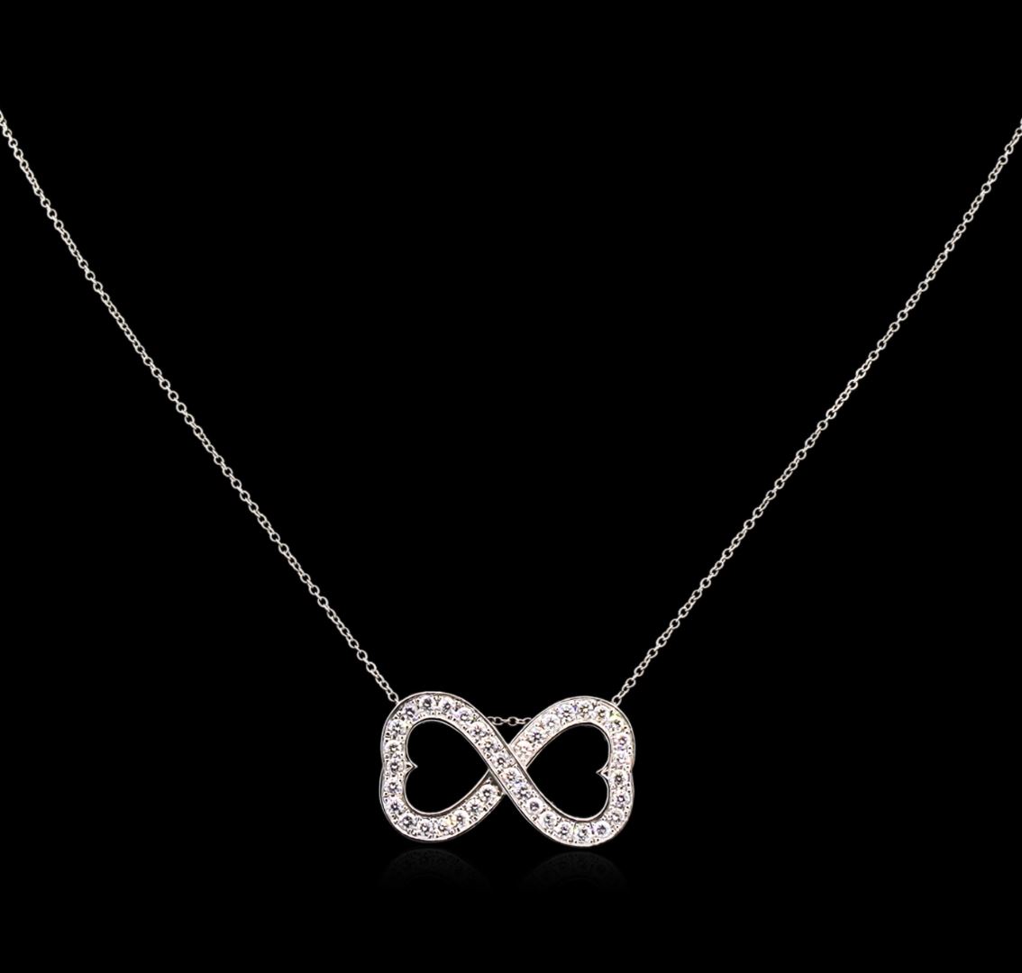 One infinity pendant with chain featuring: 14KT white gold weighing 6.16 grams containing diamonds with a total weight of 0.60ct.