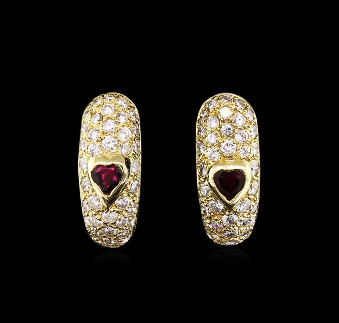 One pair of earrings featuring: 14KT yellow gold weighing 6.95 grams containing rubies with a total weight of 0.60ct and diamonds with a total weight of 1.25ct.
