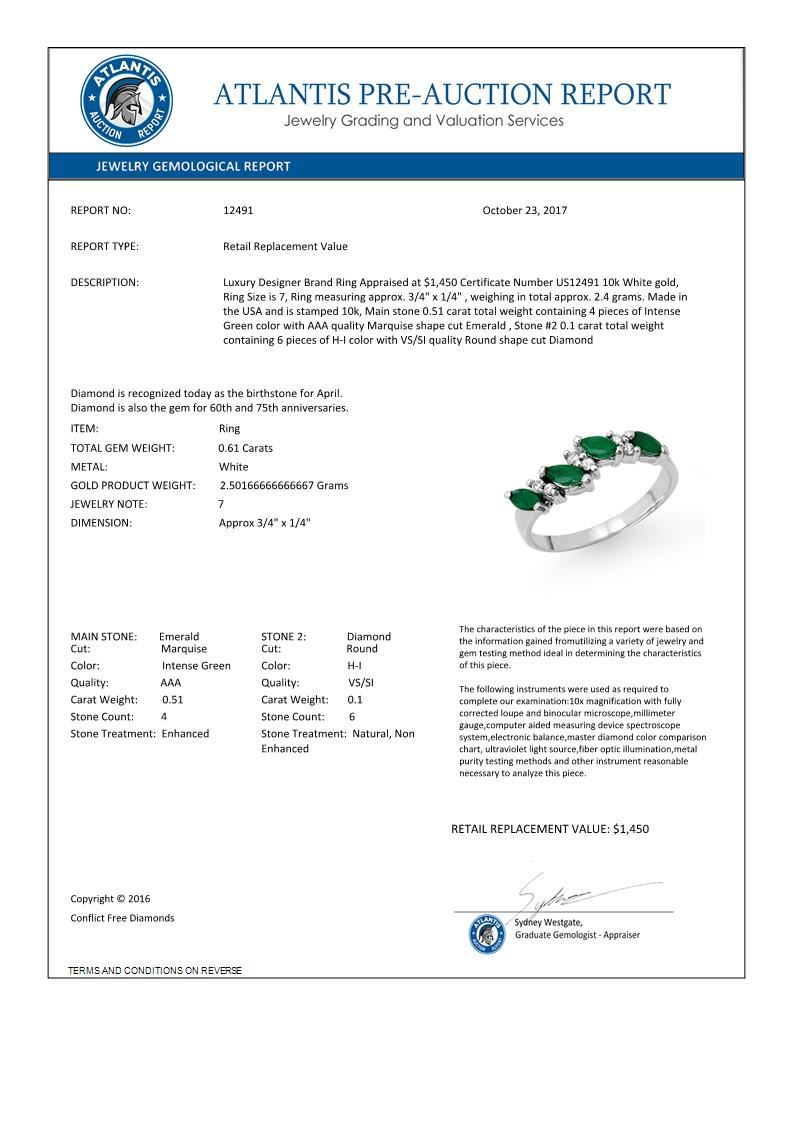 REF-22M2H -12491 ---- 0.61 CTW Emerald & Diamond Ring 10K White Gold ---- Luxury Designer Brand Ring Appraised at $1,450 Certificate Number US12491 10k White gold, Ring Size is 7, Ring measuring approx. 3/4" x 1/4" , weighing in total approx. 2.4 grams. Made in the USA and is stamped 10k, Main stone 0.51 carat total weight containing 4 pieces of Intense Green color with AAA quality Marquise shape cut Emerald , Stone #2 0.1 carat total weight containing 6 pieces of H-I color with VS/SI quality Round shape cut Diamond