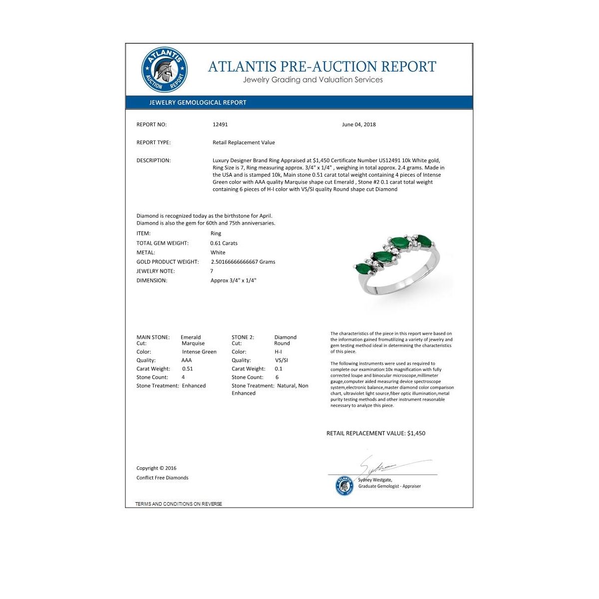 REF-22M2H -12491 ---- 0.61 CTW Emerald & Diamond Ring 10K White Gold ---- Luxury Designer Brand Ring Appraised at $1,450 Certificate Number US12491 10k White gold, Ring Size is 7, Ring measuring approx. 3/4" x 1/4" , weighing in total approx. 2.4 grams. Made in the USA and is stamped 10k, Main stone 0.51 carat total weight containing 4 pieces of Intense Green color with AAA quality Marquise shape cut Emerald , Stone #2 0.1 carat total weight containing 6 pieces of H-I color with VS/SI quality Round shape cut Diamond