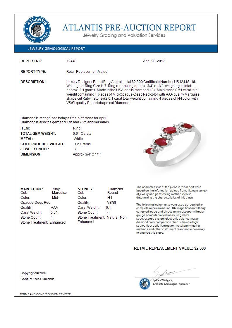 0.61 CTW Ruby & Diamond Ring 18K White Gold ---- Luxury Designer Brand Ring Appraised Retail Price at $2,300 ---- SKU Number US12448 18k White gold Ring Size is 7, Ring measuring approx. 3/4" x 1/4" , weighing in total approx. 3.1 grams. Made in the USA and is stamped 18k, Main stone 0.51 carat total weight containing 4 pieces of Mid-Opaque-Deep Red color with AAA quality Marquise shape cut Ruby , Stone #2 0.1 carat total weight containing 4 pieces of H-I color with VS/SI quality Round shape cut