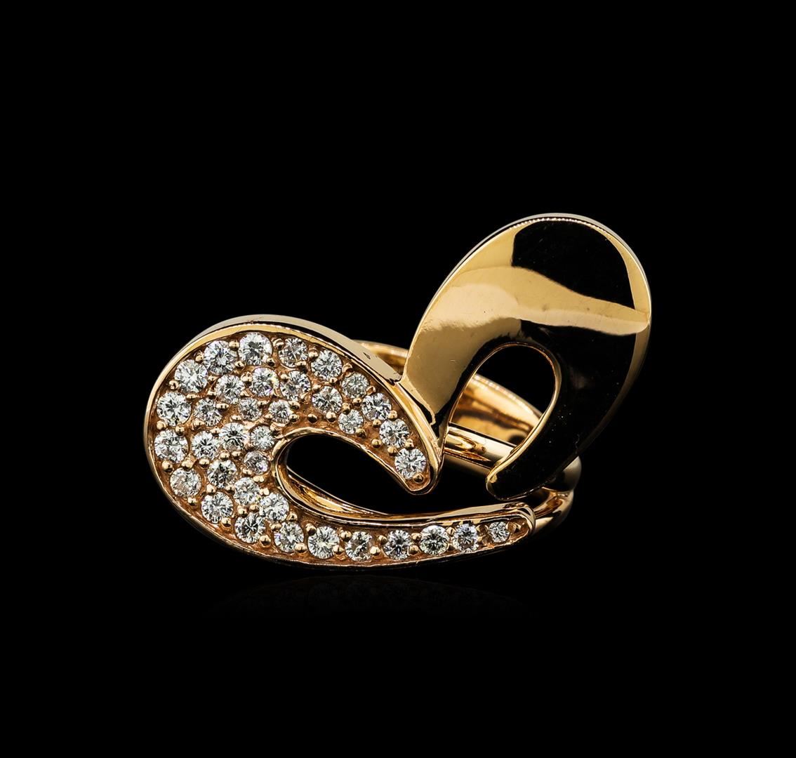 One electronically tested 14KT rose gold lady's combination cast & assembled abstract heart shape ring with a bright polish finish. The featured lady's ring has a shank measuring 5.55 millimeters wide. Identified with markings of 'K14'. Condition is new, good workmanship. Containing: Twenty-Six prong set round brilliant cut diamonds, measuring 1.70 - 1.60 x 1.02mm (depth est.) approximate total weight of 26 Stones = 0.44ct. Graded in the setting. Clarity SI-1 to SI-2. Color: H - I Cut Good Five prong set round brilliant cut diamonds, measuring 1.90 - 1.80 x 1.15mm (depth est.) approximate total weight of 5 Stones = 0.12ct. Graded in the setting. Clarity SI-1 to SI-2. Color: H - I Cut Good Five prong set round brilliant cut diamonds, measuring 1.40 - 1.35 x 0.86mm (depth est.) approximate total weight of 5 Stones = 0.05ct. Graded in the setting. Clarity SI-1 to SI-2. Color: H - I Cut Good. Total Weight of Diamonds 0.61ct.. Total Weight of Ring 7.70gm GAS Appraised at $2,870.00.