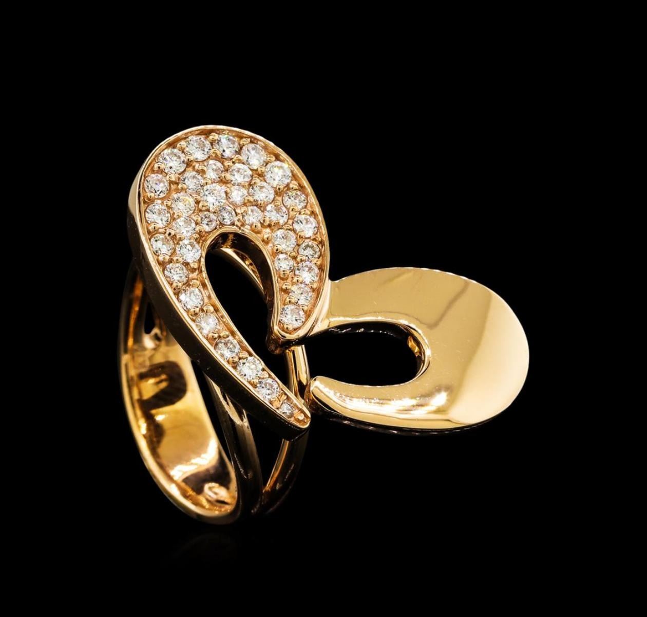 One electronically tested 14KT rose gold lady's combination cast & assembled abstract heart shape ring with a bright polish finish. The featured lady's ring has a shank measuring 5.55 millimeters wide. Identified with markings of 'K14'. Condition is new, good workmanship. Containing: Twenty-Six prong set round brilliant cut diamonds, measuring 1.70 - 1.60 x 1.02mm (depth est.) approximate total weight of 26 Stones = 0.44ct. Graded in the setting. Clarity SI-1 to SI-2. Color: H - I Cut Good Five prong set round brilliant cut diamonds, measuring 1.90 - 1.80 x 1.15mm (depth est.) approximate total weight of 5 Stones = 0.12ct. Graded in the setting. Clarity SI-1 to SI-2. Color: H - I Cut Good Five prong set round brilliant cut diamonds, measuring 1.40 - 1.35 x 0.86mm (depth est.) approximate total weight of 5 Stones = 0.05ct. Graded in the setting. Clarity SI-1 to SI-2. Color: H - I Cut Good. Total Weight of Diamonds 0.61ct.. Total Weight of Ring 7.70gm GAS Appraised at $2,870.00.