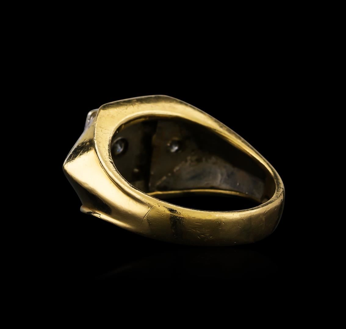 One electronically tested 14KT yellow and white gold man's combination cast & assembled wedding ring with a bright polish with milgrain detailing finish. The featured lady's ring has a shank measuring 4.4 millimeters wide. Identified with markings of "14K". Condition is used. Containing: One prong set round brilliant cut diamond, measuring 3.90 - 3.85 x 2.33mm (depth est.) approximate weight of 0.22ct. Graded in the setting. Clarity: SI-1. Color: I. Cut Good Two prong set round brilliant cut diamonds, measuring 2.82 - 2.80 x 1.74mm (depth est.) approximate total weight of 2 Stones = 0.17ct. Graded in the setting. Clarity: VS-1 to VS-2. Color: I - Good Four prong set round brilliant cut diamonds, measuring 2.45 - 2.40 x 1.51mm (depth est.) approximate total weight of 4 Stones = 0.22ct. Graded in the setting. Clarity: VS-2 to SI-1. Color: I - Good. Total Weight of Diamonds 0.61ct. Total Weight of Ring 7.40gm. GAS Appraised at $2,815.00.