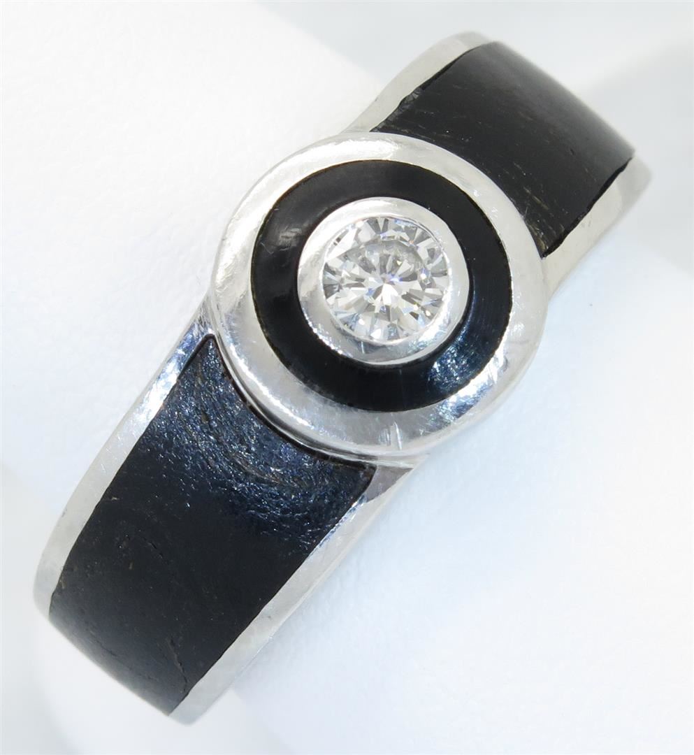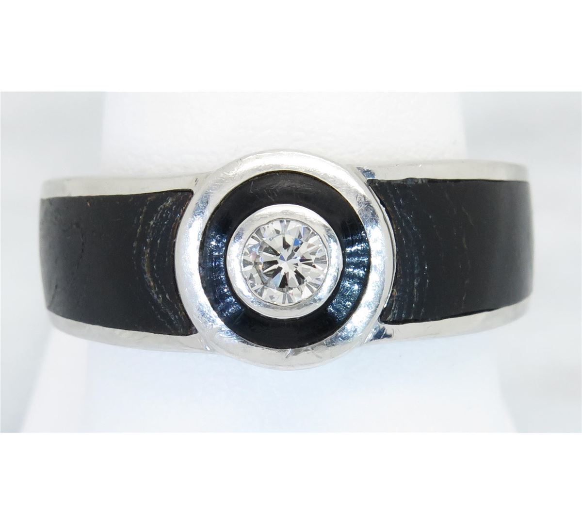 One tested designer platinum diamond and black coral ring. Containing: One Round Brilliant Cut Diamond. Approximate Size: .30CT, Clarity: VVS1, Color: H. 18 Round Brilliant Cut Diamonds. Two black coral inlays. Approximate total diamond weight: .61CTW. All diamonds are graded in the mounting unless otherwise stated. Weight of ring: 16.1 grams, Size: 8.5. This ring is from the very exclusive "Rock N' Roll" line of Hawaiian designer Bernard K Passman.