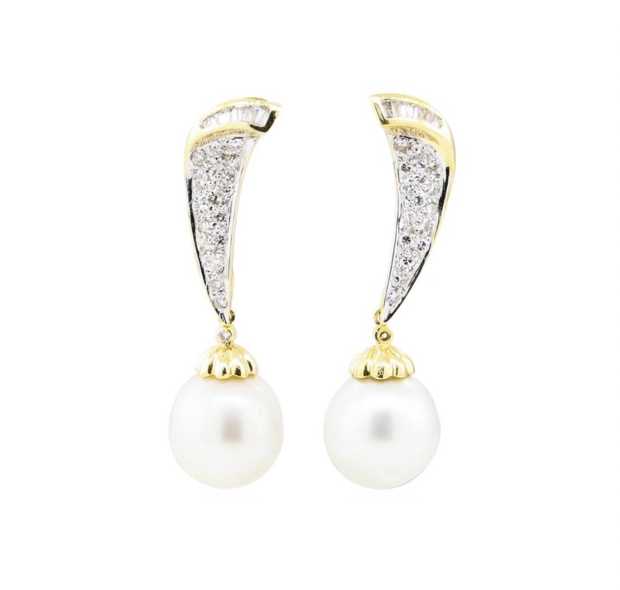 One pair electronically tested 18KT yellow gold lady's combination cast & assembled fashion dangle earrings with medium friction backs with a bright polish finish. The featured lady's earrings have a dangle measuring approximately 39 millimeters. The pearl dangles are removable. Identified with markings of '18K 750'. Condition is like new, good workmanship. Containing: Two south sea cultured pearls, 11.8mm to 11.5mm in size. The pearls are white in color with a good luster, off round, and lightly blemished with very good matching. Graded in the setting. Fifteen channel set baguette cut (tapered) diamonds, measuring from 1.40 x 0.90 x 0.77mm (depth est.) to 1.90 x 1.00 x 0.85mm (depth est.) approximate total weight of 15 Stones = 0.17ct. Graded in the setting. Color H - I Clarity VS-1 to VS-2 Cut Very Good Thirty-Four bead set round brilliant cut diamonds, measuring 1.60 - 1.40 x 0.93mm (depth est.) approximate total weight of 34 Stones = 0.44ct. Graded in the setting. Color H - I Clarity VS-2 to SI-1 Cut Very Good. Total Weight of Diamonds 0.61ct.. Total Weight of Earrings 10.30gm GAS Appraised at $6600.00. GAS Appraised.