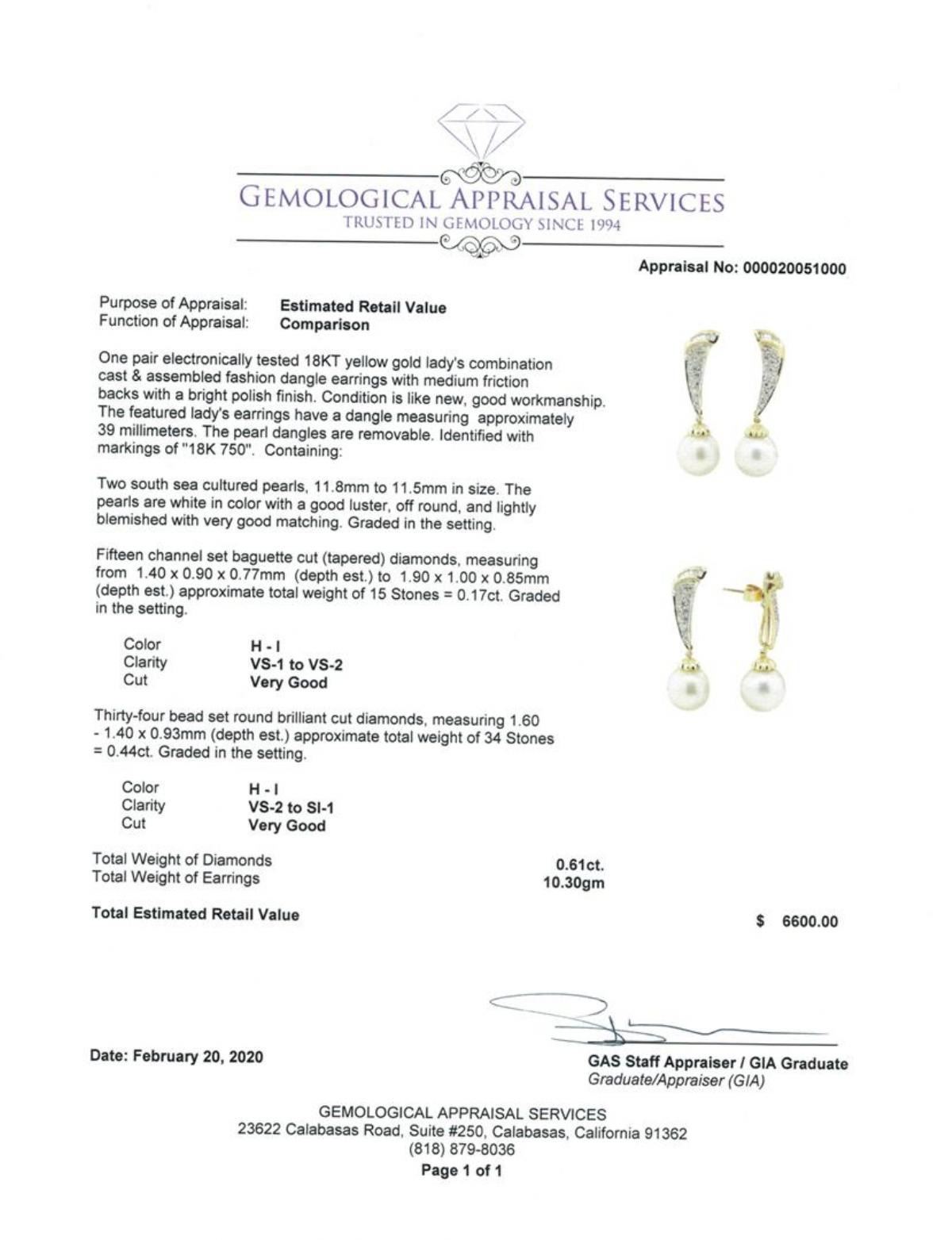 One pair electronically tested 18KT yellow gold lady's combination cast & assembled fashion dangle earrings with medium friction backs with a bright polish finish. The featured lady's earrings have a dangle measuring approximately 39 millimeters. The pearl dangles are removable. Identified with markings of '18K 750'. Condition is like new, good workmanship. Containing: Two south sea cultured pearls, 11.8mm to 11.5mm in size. The pearls are white in color with a good luster, off round, and lightly blemished with very good matching. Graded in the setting. Fifteen channel set baguette cut (tapered) diamonds, measuring from 1.40 x 0.90 x 0.77mm (depth est.) to 1.90 x 1.00 x 0.85mm (depth est.) approximate total weight of 15 Stones = 0.17ct. Graded in the setting. Color H - I Clarity VS-1 to VS-2 Cut Very Good Thirty-Four bead set round brilliant cut diamonds, measuring 1.60 - 1.40 x 0.93mm (depth est.) approximate total weight of 34 Stones = 0.44ct. Graded in the setting. Color H - I Clarity VS-2 to SI-1 Cut Very Good. Total Weight of Diamonds 0.61ct.. Total Weight of Earrings 10.30gm GAS Appraised at $6600.00. GAS Appraised.