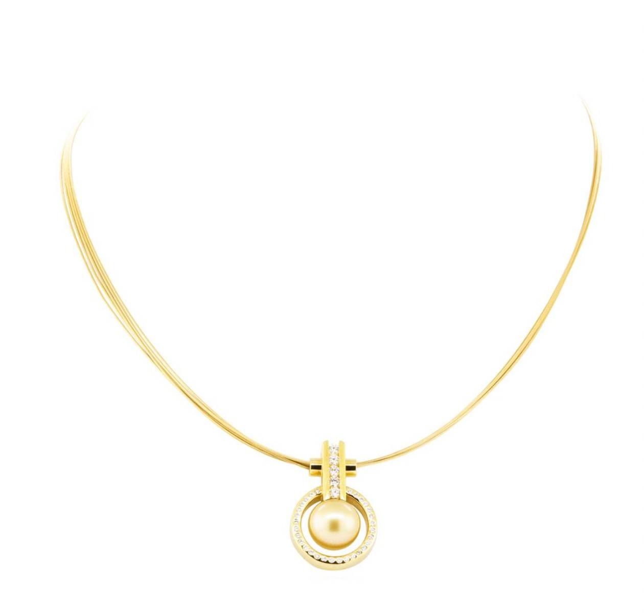One electronically tested 18KT yellow gold lady's combination cast & assembled fashion pendant and chain 18.0' long, multi-strand cable chain with a spring loaded plunger clasp with a bright polish finish. Trademark is TDL. Identified with markings of '18K'. Condition is like new, good workmanship. Containing: One south sea cultured pearl, 12.0mm to 11.9mm in size. The pearl is golden in color with a very good luster, round, and clean. Graded in the setting. Five channel set round brilliant cut diamonds, measuring 2.70 - 2.65 x 1.66mm (depth est.) approximate total weight of 5 Stones = 0.36ct. Graded in the setting. Color F - G Clarity VS-1 to VS-2 Cut Excellent Thirty bezel set round brilliant cut diamonds, measuring 1.30 - 1.30 x 0.81mm (depth est.) approximate total weight of 30 Stones = 0.25ct. Graded in the setting. Color F - G Clarity VS-1 to VS-2 Cut Excellent. Total Weight of Diamonds 0.61ct.. Total Weight of Pendant And Chain 24.20gm GAS Appraised at $8180.00. GAS Appraised.