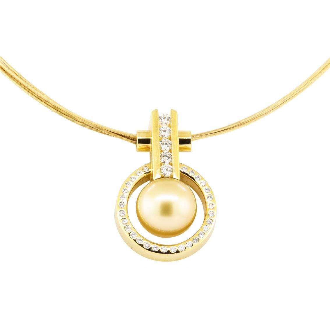 One electronically tested 18KT yellow gold lady's combination cast & assembled fashion pendant and chain 18.0' long, multi-strand cable chain with a spring loaded plunger clasp with a bright polish finish. Trademark is TDL. Identified with markings of '18K'. Condition is like new, good workmanship. Containing: One south sea cultured pearl, 12.0mm to 11.9mm in size. The pearl is golden in color with a very good luster, round, and clean. Graded in the setting. Five channel set round brilliant cut diamonds, measuring 2.70 - 2.65 x 1.66mm (depth est.) approximate total weight of 5 Stones = 0.36ct. Graded in the setting. Color F - G Clarity VS-1 to VS-2 Cut Excellent Thirty bezel set round brilliant cut diamonds, measuring 1.30 - 1.30 x 0.81mm (depth est.) approximate total weight of 30 Stones = 0.25ct. Graded in the setting. Color F - G Clarity VS-1 to VS-2 Cut Excellent. Total Weight of Diamonds 0.61ct.. Total Weight of Pendant And Chain 24.20gm GAS Appraised at $8180.00. GAS Appraised.