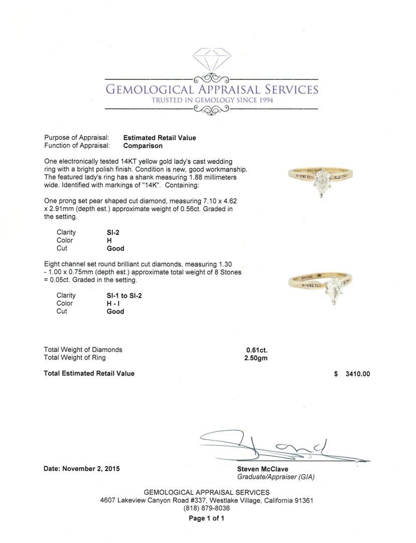 One electronically tested 14KT yellow gold lady's cast wedding ring with a bright polish finish. The featured lady's ring has a shank measuring 1.88 millimeters wide. Identified with markings of "14K". Condition is new, good workmanship. Containing: One prong set pear shaped cut diamond, measuring 7.10 x 4.62 x 2.91mm (depth est.) approximate weight of 0.56ct. Graded in the setting. Clarity: SI-2. Color: Good Eight channel set round brilliant cut diamonds, measuring 1.30 - 1.00 x 0.75mm (depth est.) approximate total weight of 8 Stones = 0.05ct. Graded in the setting. Clarity: SI-1 to SI-2. Color: H - I. Cut Good. Total Weight of Diamonds 0.61ct. Total Weight of Ring 2.50gm. GAS Appraised at $3,410.00.