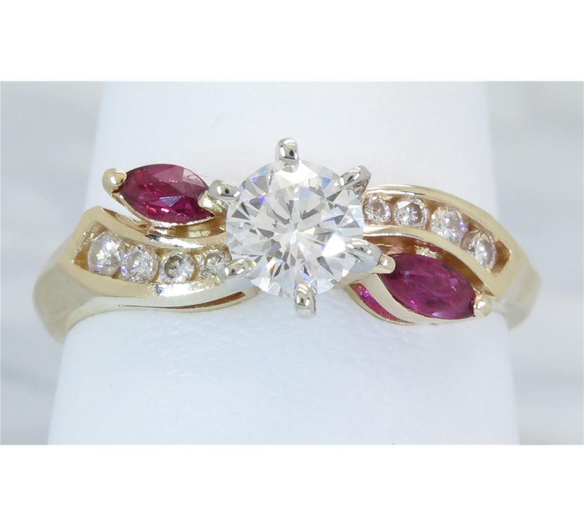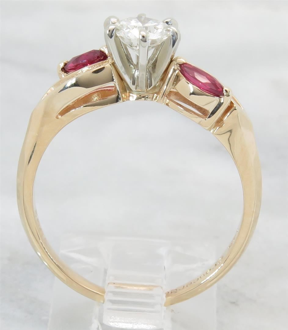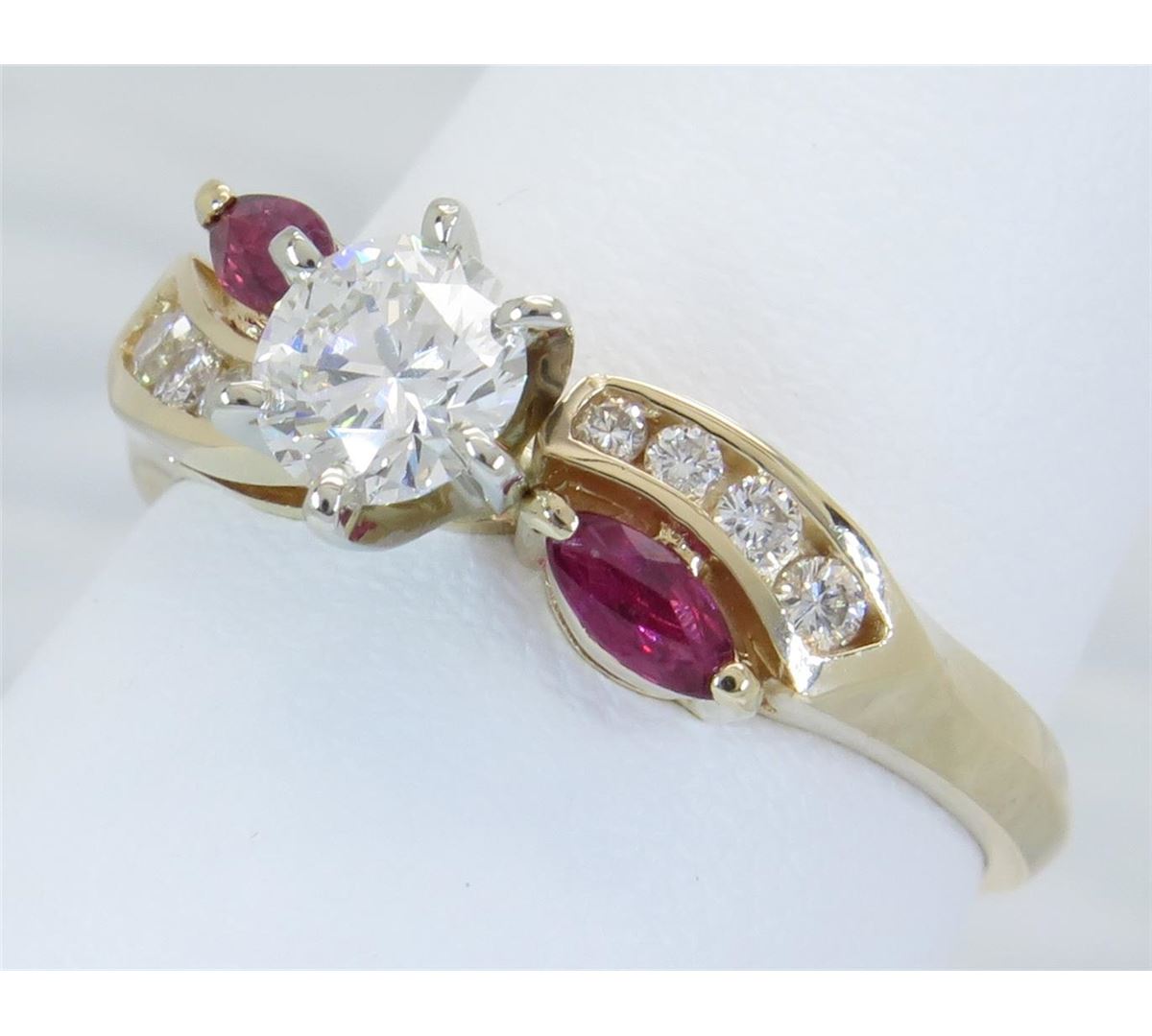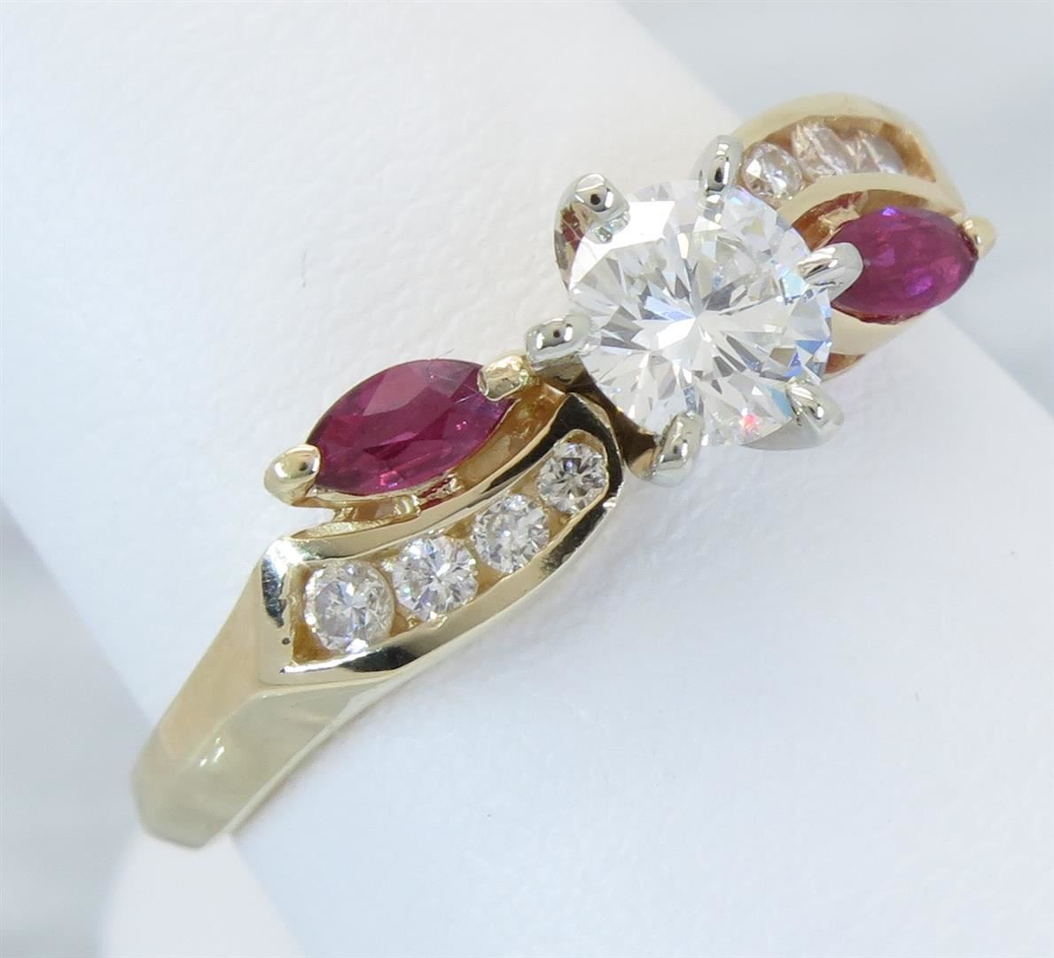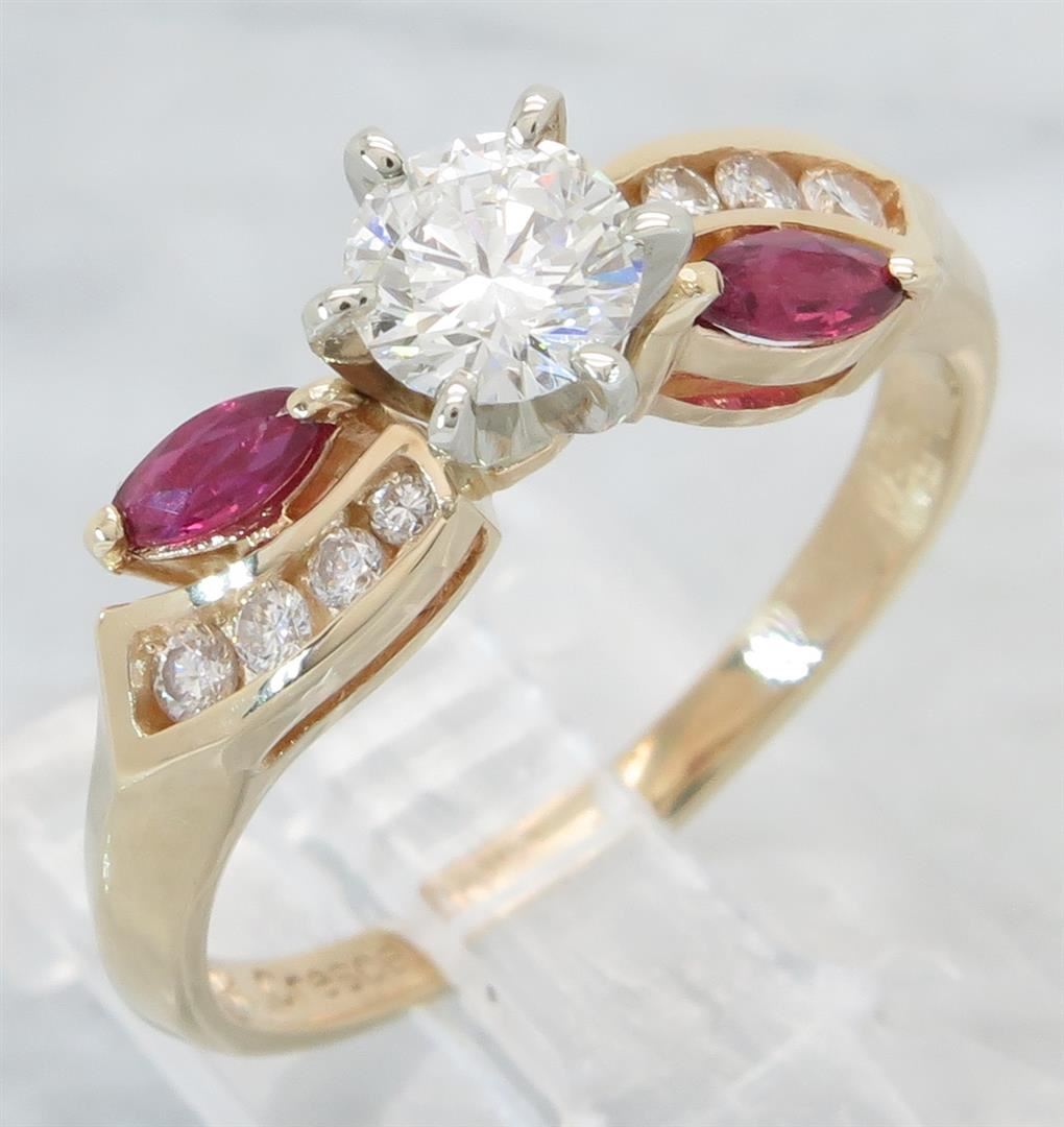 One tested 14K yellow gold diamond and ruby ring. Containing: One Round Brilliant Cut Diamond. Approximate Size: .46CT, Clarity: VS2, Color: G-H. Eight Round Brilliant Cut Diamonds, two 4.3MM X 2.2MM rubies. Approximate total diamond weight: .61CTW. Diamonds are graded in the mounting, unless otherwise stated. Weight: 3.5 grams, Size: 7.5.