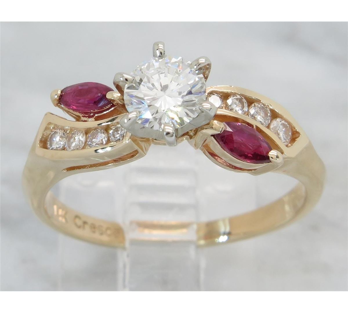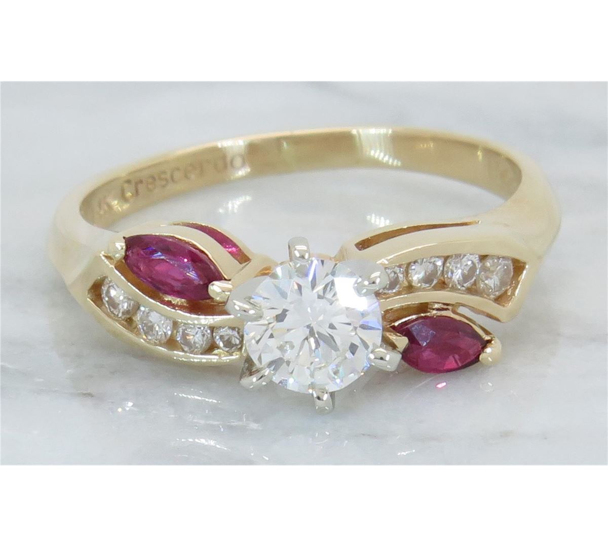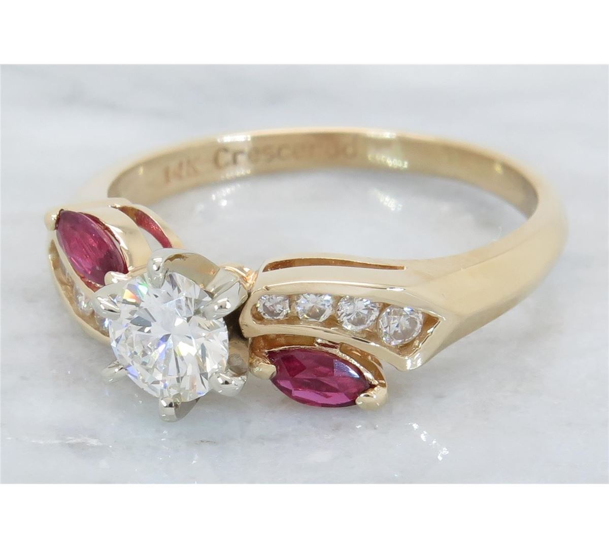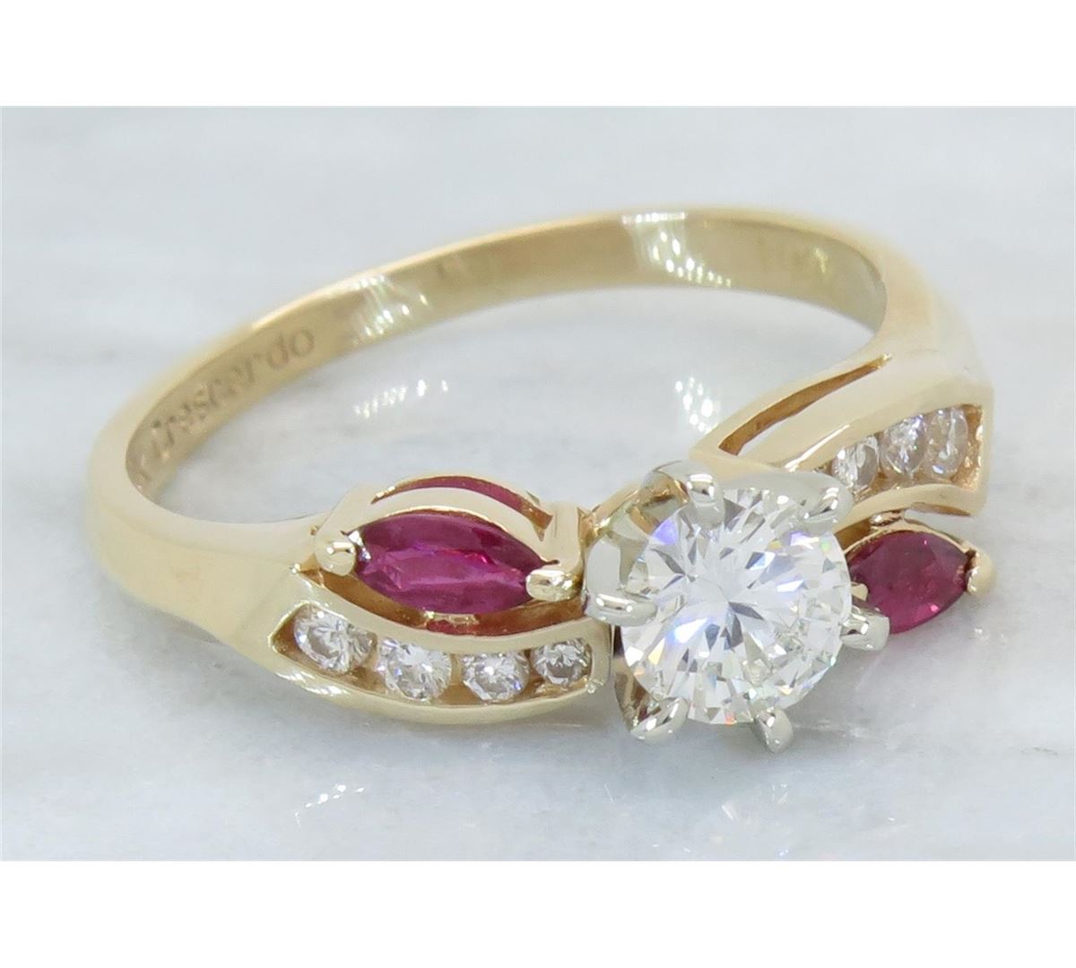 One tested 14K yellow gold diamond and ruby ring. Containing: One Round Brilliant Cut Diamond. Approximate Size: .46CT, Clarity: VS2, Color: G-H. Eight Round Brilliant Cut Diamonds, two 4.3MM X 2.2MM rubies. Approximate total diamond weight: .61CTW. Diamonds are graded in the mounting, unless otherwise stated. Weight: 3.5 grams, Size: 7.5.