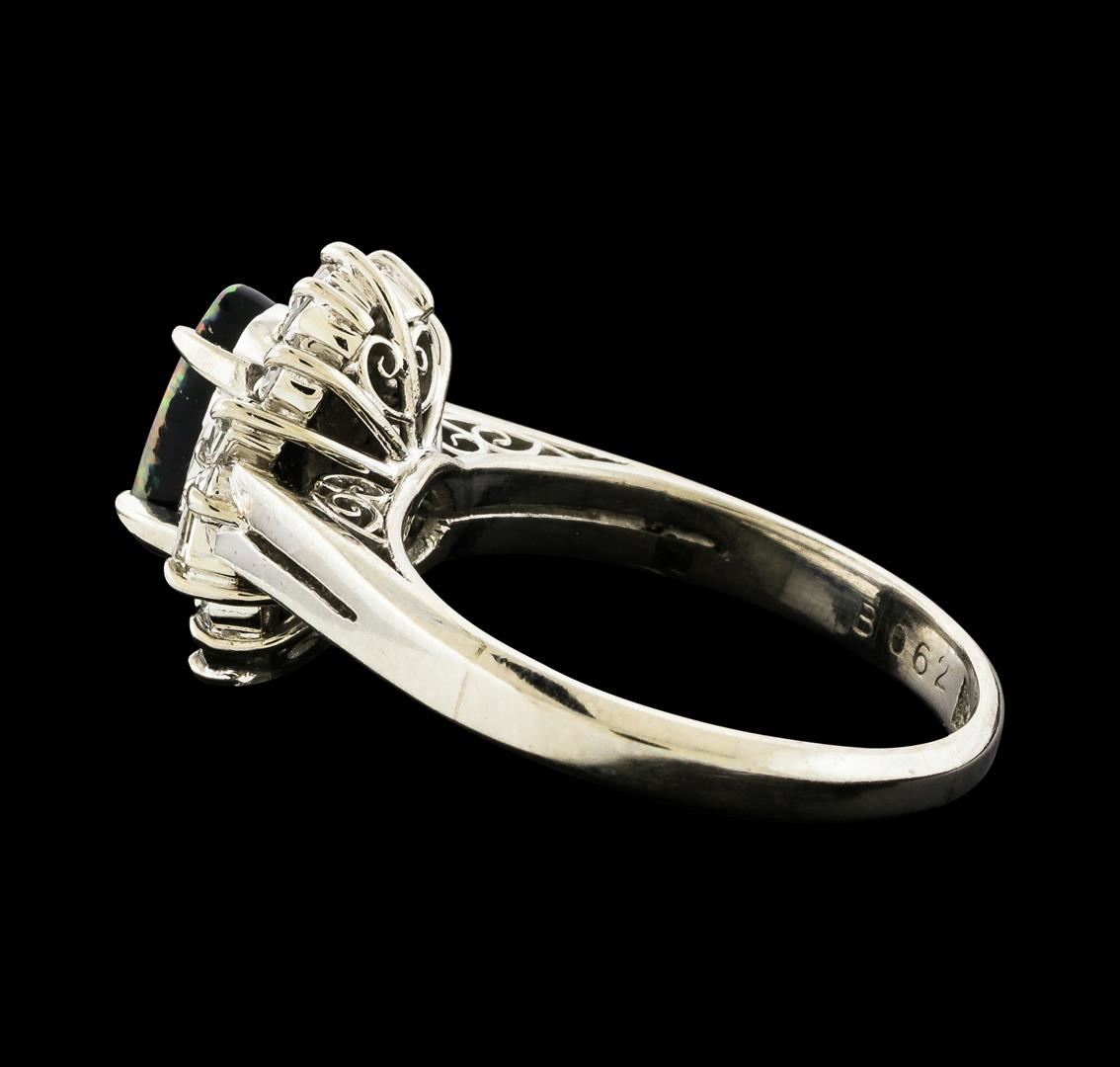 One ring featuring: Platinum containing Black Opal with a total weight of 0.62ct and Diamonds with a total weight of 0.29ct. Total Weight of Ring: 5 grams.