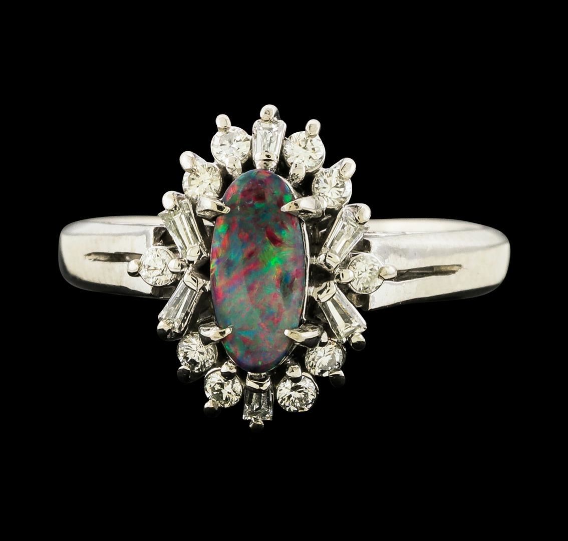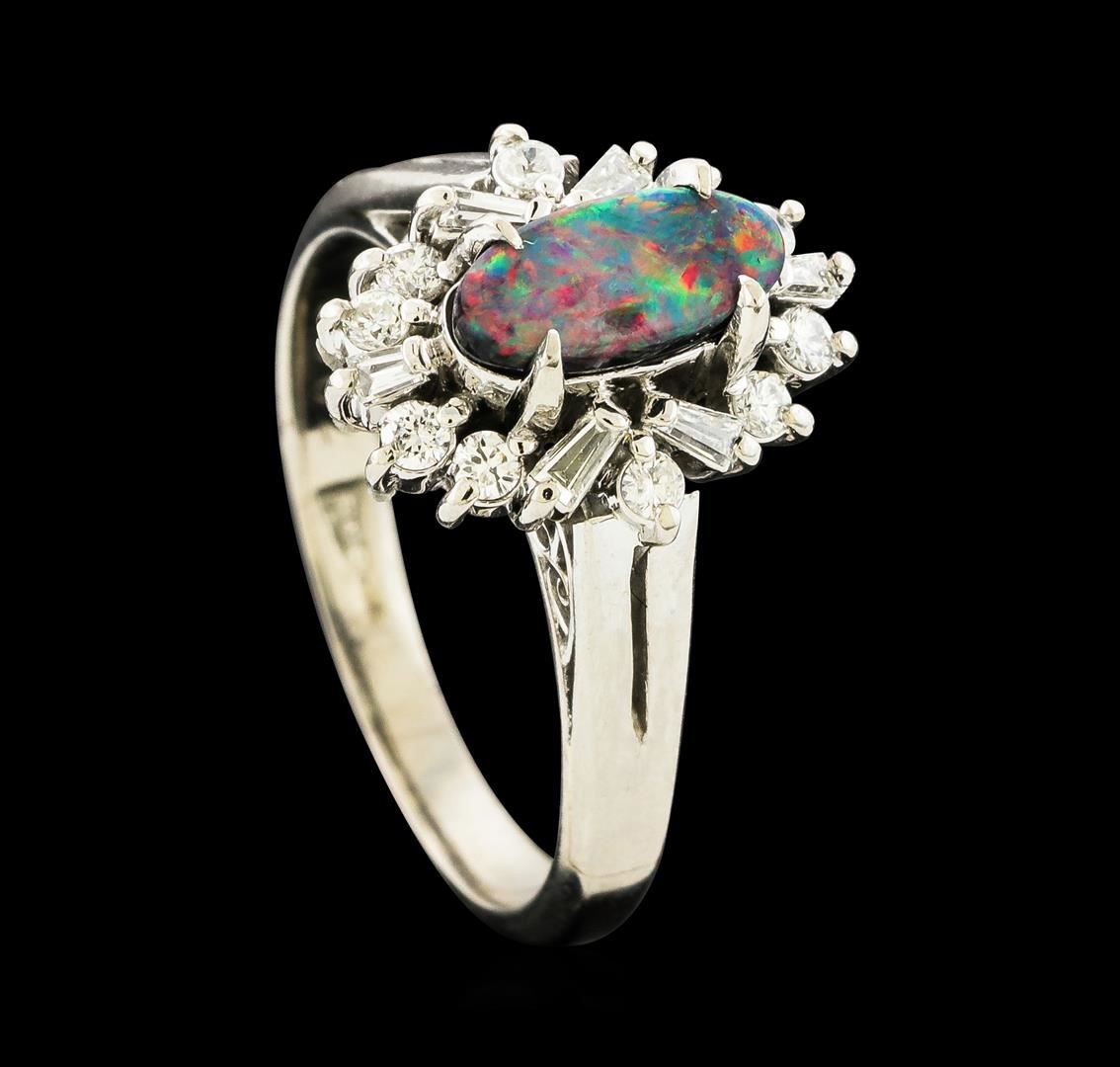 One ring featuring: Platinum containing Black Opal with a total weight of 0.62ct and Diamonds with a total weight of 0.29ct. Total Weight of Ring: 5 grams.