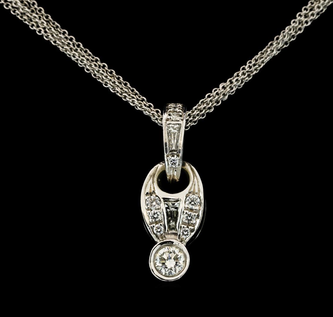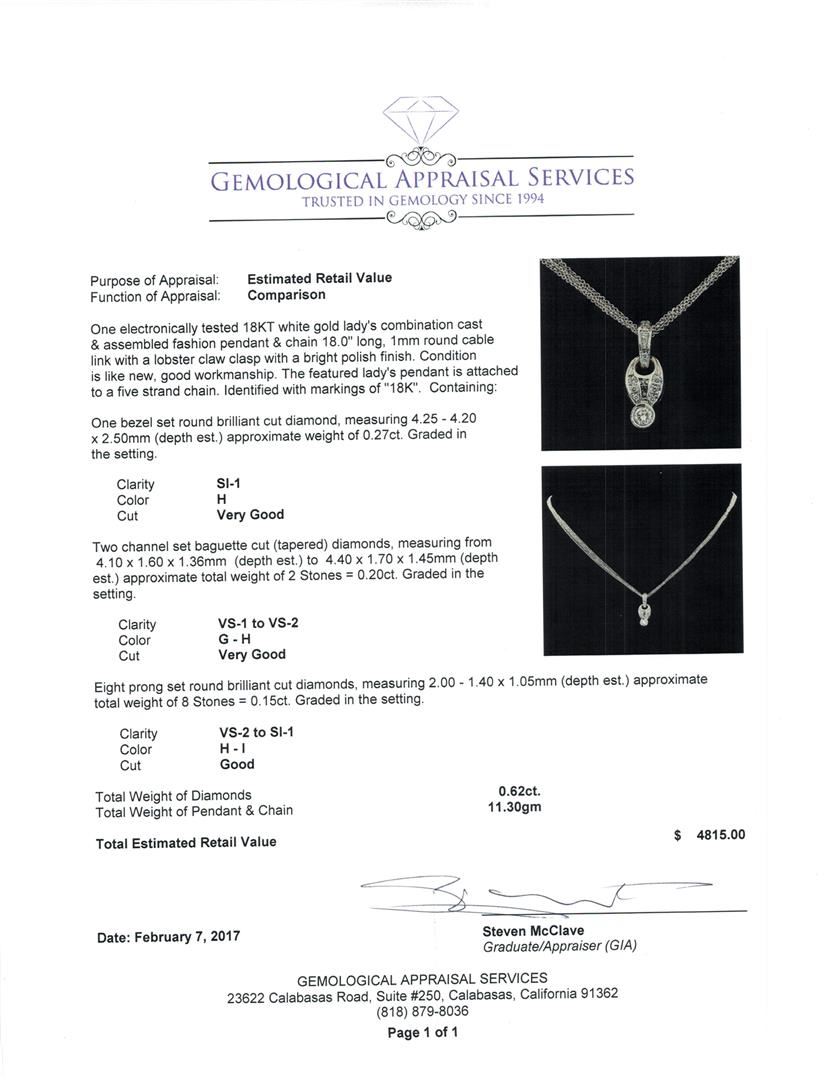 One electronically tested 18KT white gold lady's combination cast & assembled fashion pendant & chain 18.0' long, 1mm round cable link with a lobster claw clasp with a bright polish finish. The featured lady's pendant is attached to a five strand chain. Identified with markings of '18K'. Condition is like new, good workmanship. Containing: One bezel set round brilliant cut diamond, measuring 4.25 - 4.20 x 2.50mm (depth est.) approximate weight of 0.27ct. Graded in the setting. Clarity SI-1. Color: H Cut Very Good Two channel set baguette cut (tapered) diamonds, measuring from 4.10 x 1.60 x 1.36mm (depth est.) to 4.40 x 1.70 x 1.45mm (depth est.) approximate total weight of 2 Stones = 0.20ct. Graded in the setting. Clarity VS-1 to VS-2. Color: G - H Cut Very Good Eight prong set round brilliant cut diamonds, measuring 2.00 - 1.40 x 1.05mm (depth est.) approximate total weight of 8 Stones = 0.15ct. Graded in the setting. Clarity VS-2 to SI-1. Color: H - I Cut Good. Total Weight of Diamonds 0.62ct.. Total Weight of Pendant & Chain 11.30gm GAS Appraised at $4,815.00.