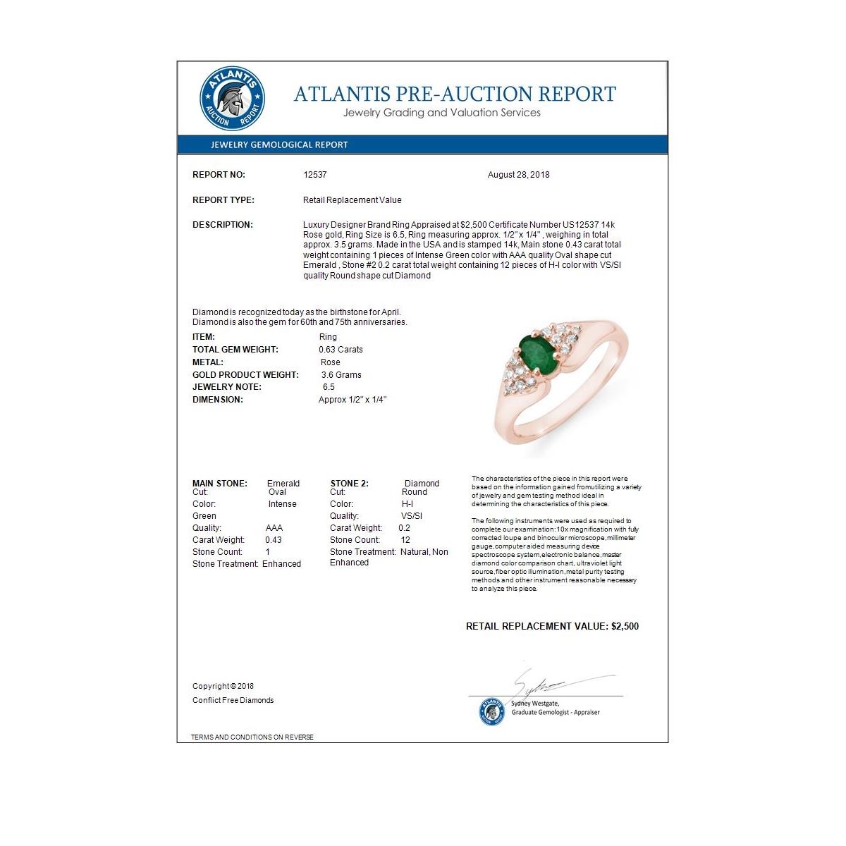 REF-38W2F -12537 ---- 0.63 CTW Emerald & Diamond Ring 14K Rose Gold ---- Luxury Designer Brand Ring Appraised at $2,500 Certificate Number US12537 14k Rose gold, Ring Size is 6.5, Ring measuring approx. 1/2" x 1/4" , weighing in total approx. 3.5 grams. Made in the USA and is stamped 14k, Main stone 0.43 carat total weight containing 1 pieces of Intense Green color with AAA quality Oval shape cut Emerald , Stone #2 0.2 carat total weight containing 12 pieces of H-I color with VS/SI quality Round shape cut Diamond