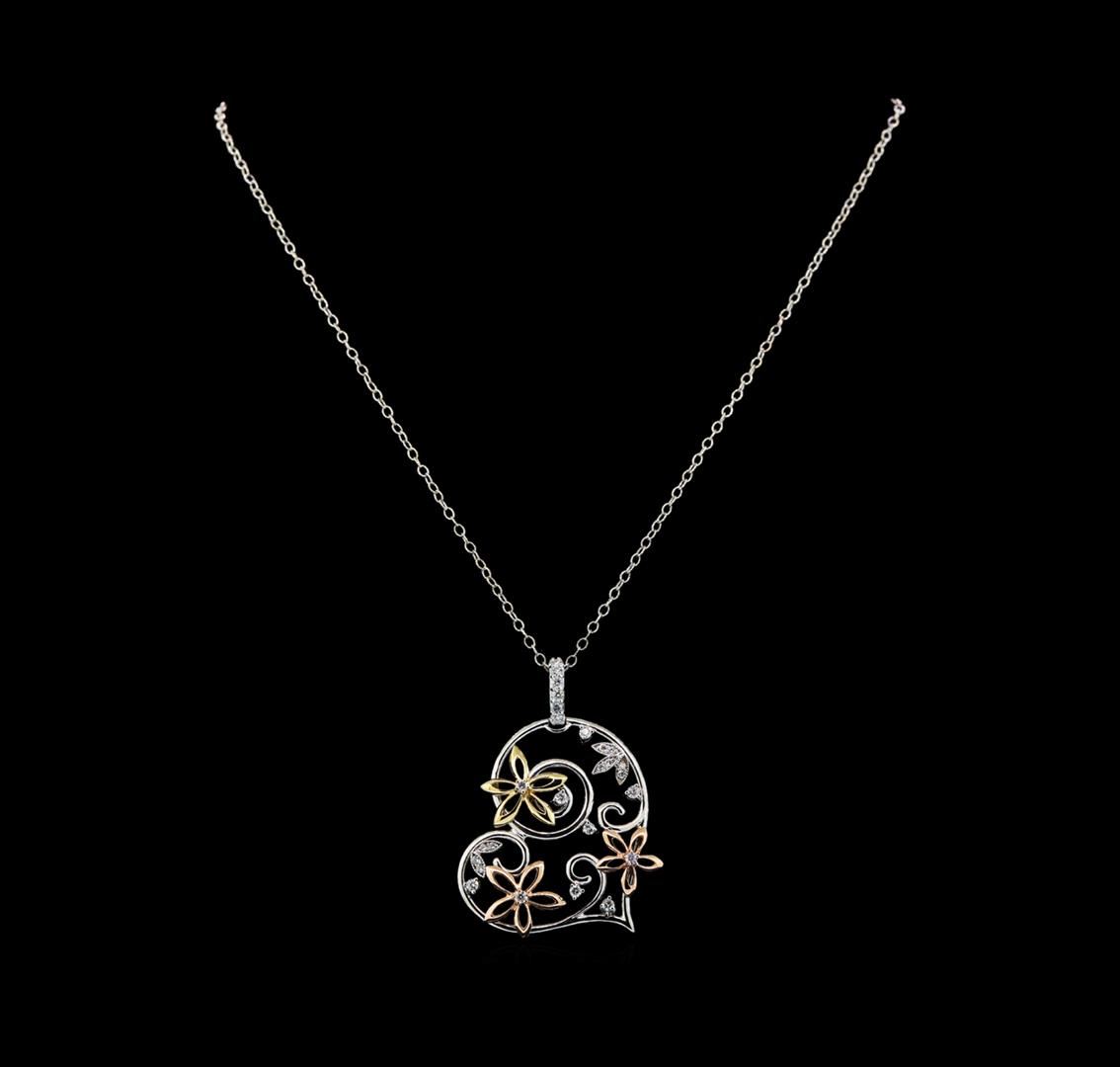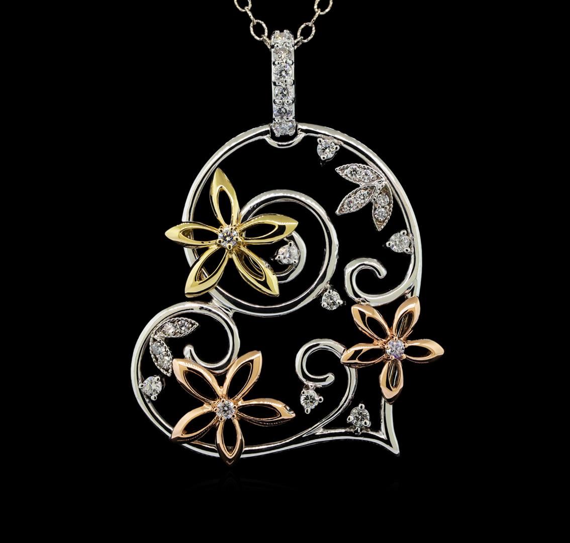 One electronically tested 14KT yellow, white, and rose gold lady's combination cast & assembled heart shape pendant & chain 18.0' long, 2mm twisted oval cable link with a lobster claw clasp with a bright polish with milgrain detailing finish. The featured lady's pendant has a triple floral motif. Identified with markings of 'K14'. Condition is new, good workmanship. Containing: Sixteen prong set round brilliant cut diamonds, measuring 2.10 - 2.00 x 1.25mm (depth est.) approximate total weight of 16 Stones = 0.51ct. Graded in the setting. Clarity SI-1 to SI-2. Color: H - I Cut Good Ten prong set round brilliant cut diamonds, measuring 1.50 - 1.40 x 0.90mm (depth est.) approximate total weight of 10 Stones = 0.12ct. Graded in the setting. Clarity SI-1 to SI-2. Color: H - I Cut Good. Total Weight of Diamonds 0.63ct.. Total Weight of Pendant & Chain 11.60gm. GAS Appraised at $3,505.00.